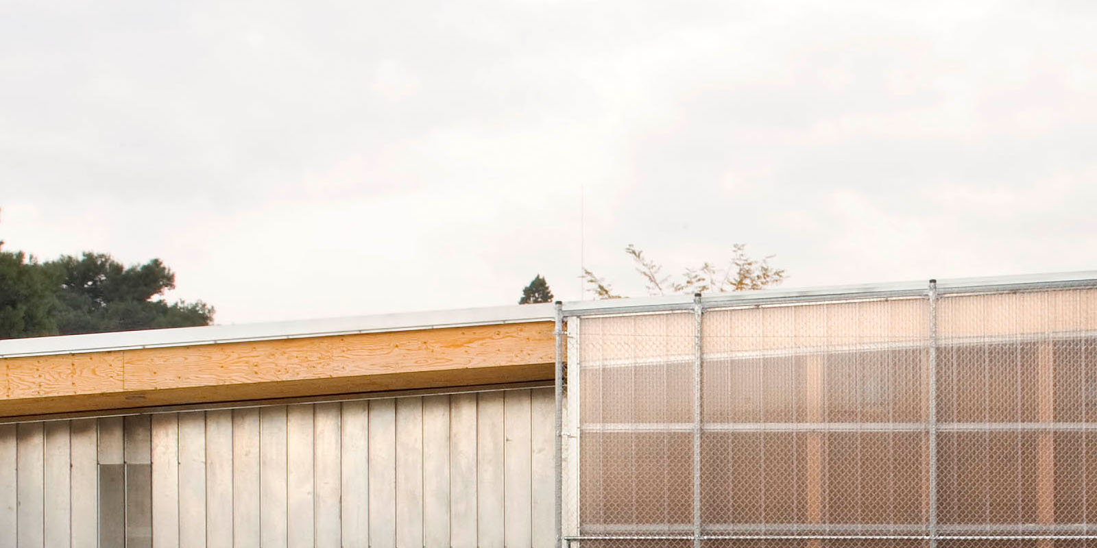 Construimos un volumen simple, prismático, únicamente deformado por la pendiente de la cubierta, paralela a la rampa de acceso al centro, y por el porche en esquina que convierte las circulaciones entre las piezas en espacio exterior cubierto.