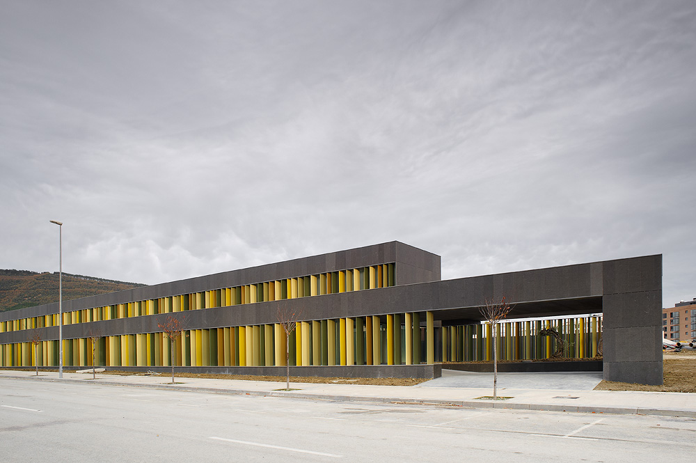 La fachada oeste del edificio se protege de la incidencia directa del sol de tarde mediante una celosía estructural de lamas verticales conformada por pilares de acero de sección romboidal.