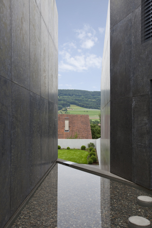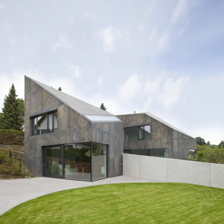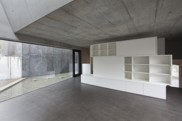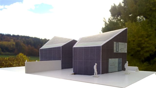 El resultado son dos cuerpos poligonales, ligeramente desplazados de los demás tratando de hacer de su proximidad calidad. Las paredes son ligeramente curvas y opuestas las del uno a las del otro. En el estrecho espacio entre las dos casas, se ha realizado una piscina de agua y un campo de grava para abrir cada una de ellas al espacio restante.