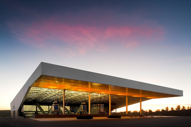 Aquí, durante el día y la noche, los trabajadores están protegidos de las lluvias de invierno y funciona como una especie de lámpara enorme en toda la zona de trabajo. De lejos esta lámpara actúa como un faro, una referencia al paisaje.