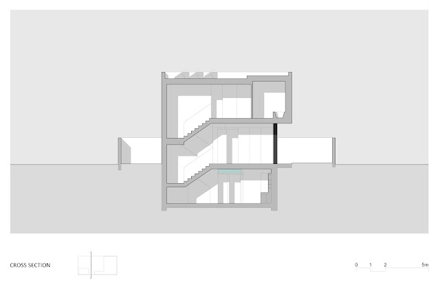 We propose, after all, to solve and clarify the question, by widening to the maximum the inhabitable premises in their global scope, both in the vertical and horizontal referentials, in both interior and exterior. The building has been thus structured in three floors, spatially related in profile, each level having specific and different characteristics.