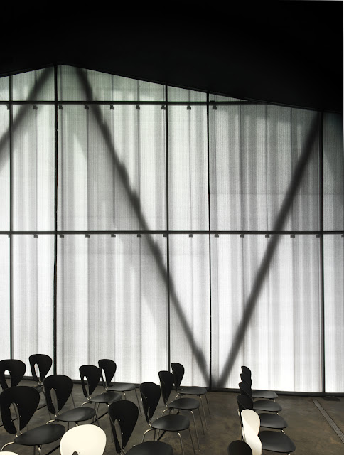 En cuanto a la ampliación, la celosía que envuelve recorrido y usos auxiliares se construirá con tubos 120.40.4 de acero oxidado, que se pliegan para formar paramentos y cubiertas en un gesto continuo, útil y bello. Tras esta celosía, una piel evanescente de policarbonato de diferentes cualidades según zonas -traslúcida, trasparente, coloreada-, y al interior de las salas (vinatería, exposiciones y actos) lonas tensadas acústicas de diferente urdimbre. Los suelos interiores serán de madera a base de parqué industrial de roble, reciclado de barricas, en la rehabilitación y hormigón teñido en masa en las piezas del jardín, reforzando tanto la imagen ligera de la ampliación como la calidez de este espacio luminoso e inmaterial.