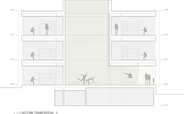 Así, la implantación respeta estrictamente las condiciones urbanísticas en cuanto a retranqueos y volumen máximo construido, al mismo tiempo que, el programa de usos se acondiciona de la mejor manera posible para optimizar recorridos y generar un edificio compacto, que permita un mantenimiento sencillo y no costoso.