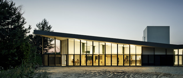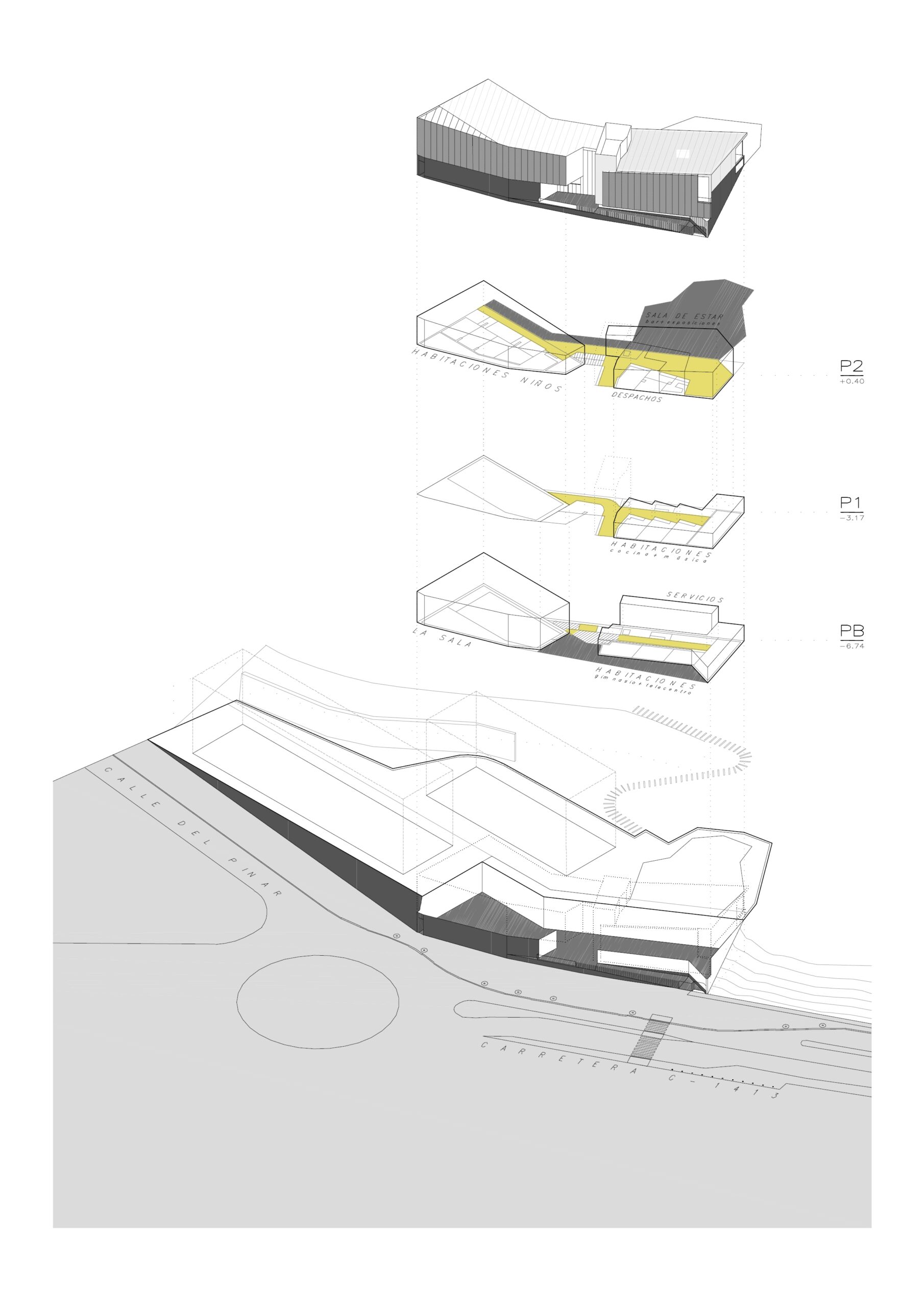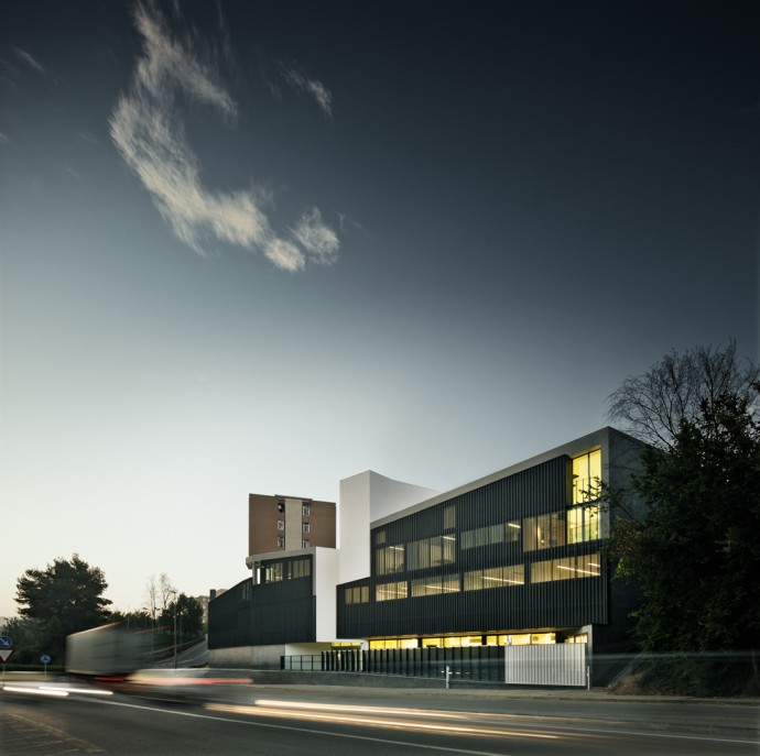 El edificio muestra frente a la carretera una imagen de solido pétreo construido a base de morteros con piedras proyectadas de diferentes tonos grises y chapas metálicas perforadas y grecadas de color ceniza, mientras que la fachada que da al bosque, de una sola planta de altura, es un cuerpo transparente y permeable. Los pilares que soportan la cubierta, en el espacio de altura generosa del centro social, están pintados simulando los arboles del exterior.