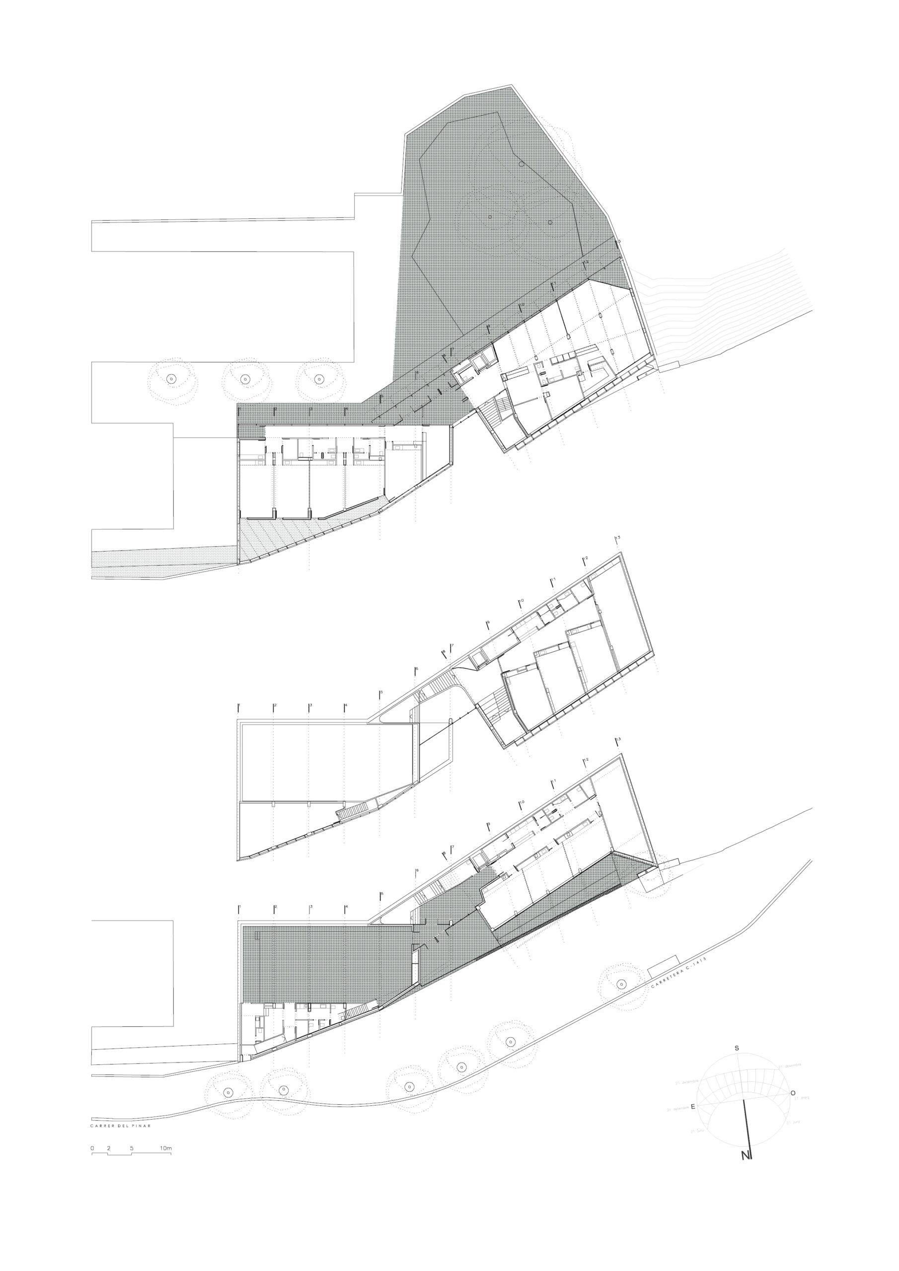 El centro socialcultural El Pinar de Rubí se asienta sobre un solar alargado de 60 metros de longitud orientado este-oeste que tiene una fuerte pendiente transversal del 52%. La fachada inferior cercana al nudo de la carretera C-1413-a esta situada a la cota +181. La fachada opuesta, sobre una meseta a cota + 189 es el final de una zona boscosa que forma parte del Catálogo del Patrimonio Arqueológico y Natural de Rubí. El edificio está en un 75% semienterrado contra un muro de contención que soporta la falda de la montaña.