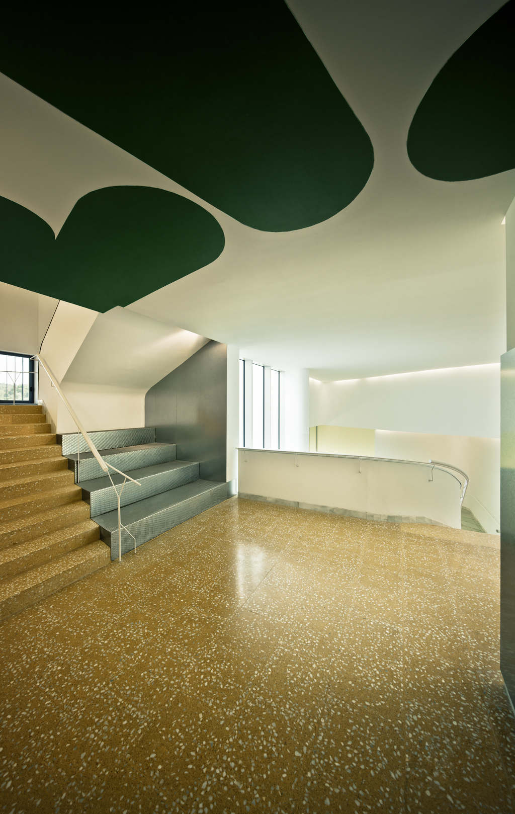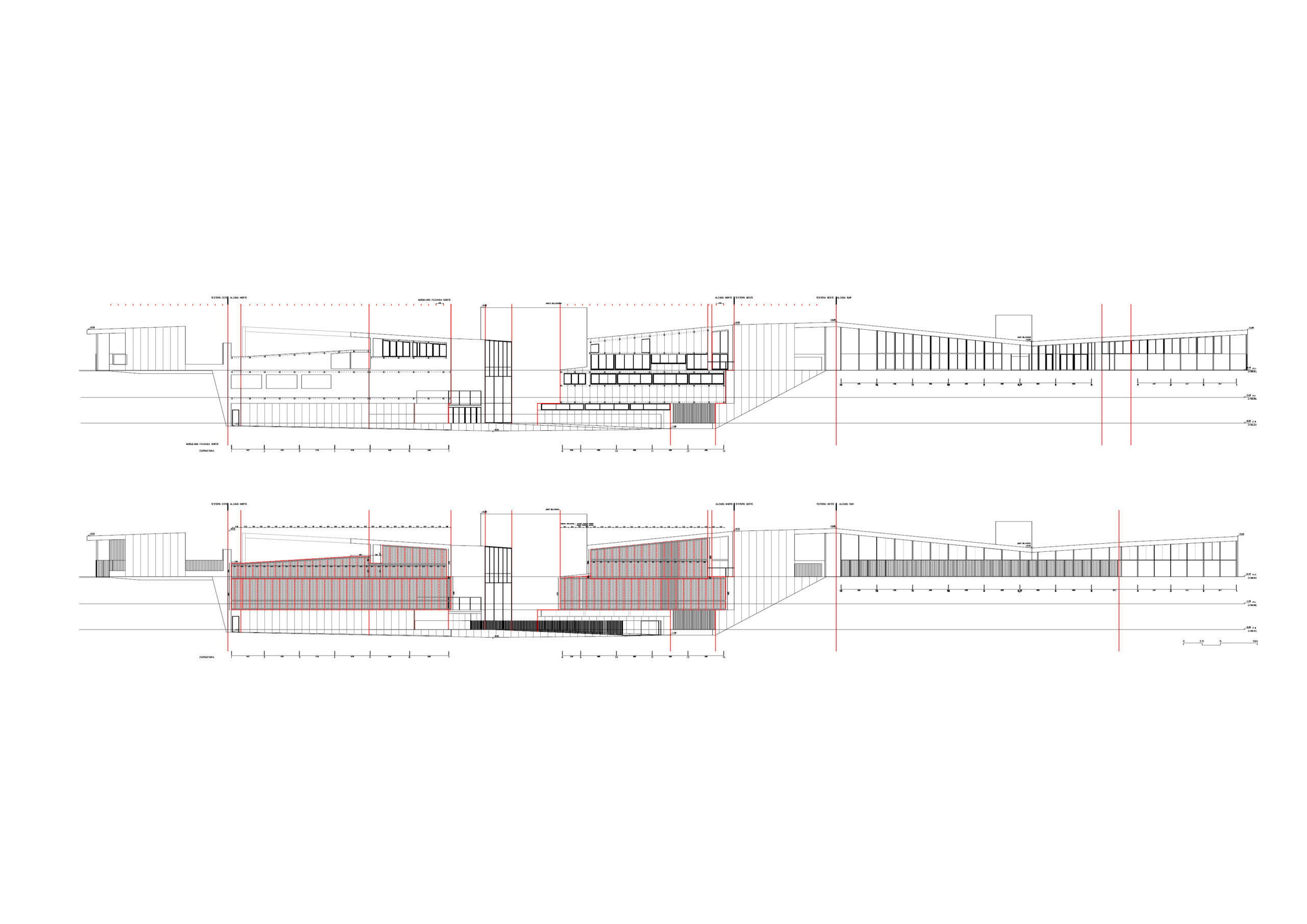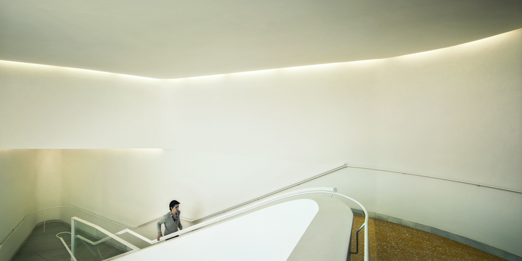 Visualmente, entre las dos alas del edificio, en colores blancos y con la ayuda de un pequeño muro cortina de tres plantas, se encuentra el punto de permeabilidad entre en las cotas inferior y superior del terreno y que es el enlace interior entre la puerta de “abajo” y la de “arriba”. Este centro vacío está ocupado por un doble espacio para las escaleras y los ascensores, funciona como conexión entre los bloques derecho e izquierdo y reproduce en imagen y funcionamiento el pequeño paso, como un desfiladero, que existía en el sitio en el estado previo a la construcción del centro.