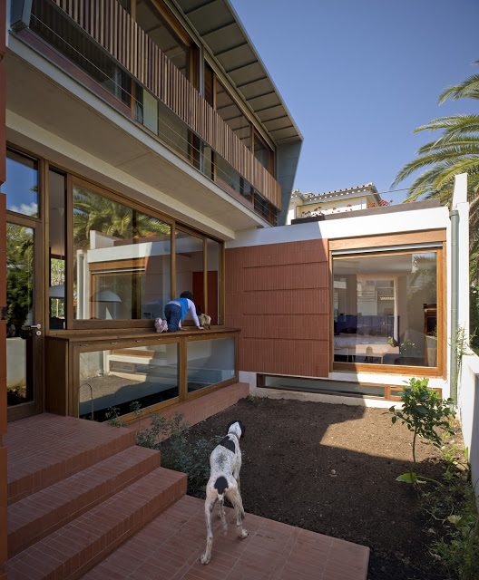 El programa, para una familia con cinco hijos, obliga al máximo aprovechamiento, con lugares para compartir y lugares para el aislamiento. Este esfuerzo se hace visible en las secciones: los bancos fijos son también lucernarios que permiten el paso de luz al sótano (uno de los mejores lugares de la casa), la escalera se convierte en una gran librería, los dormitorios se comunican con puertas correderas, de forma que cinco dormitorios se agrupan en dos galerías. Huecos en cubiertas y forjados dejan pasar la luz natural al interior.