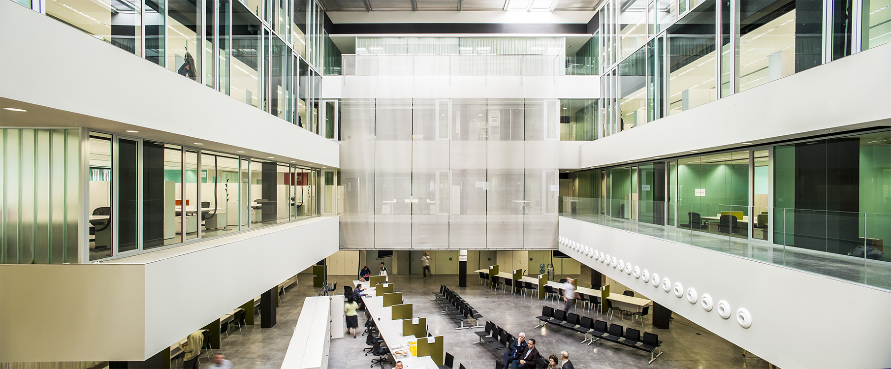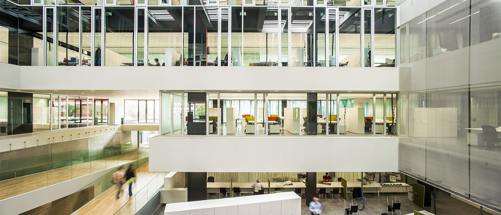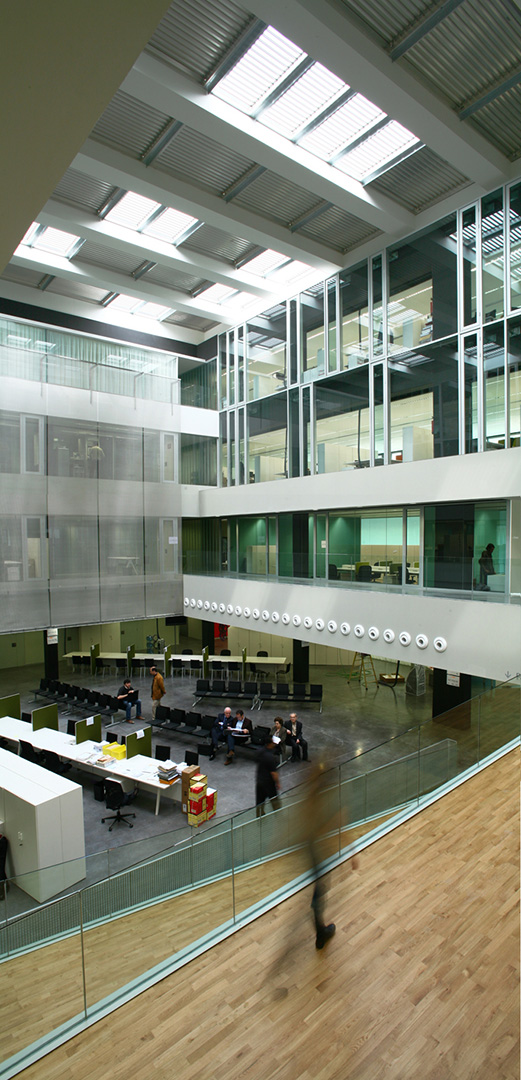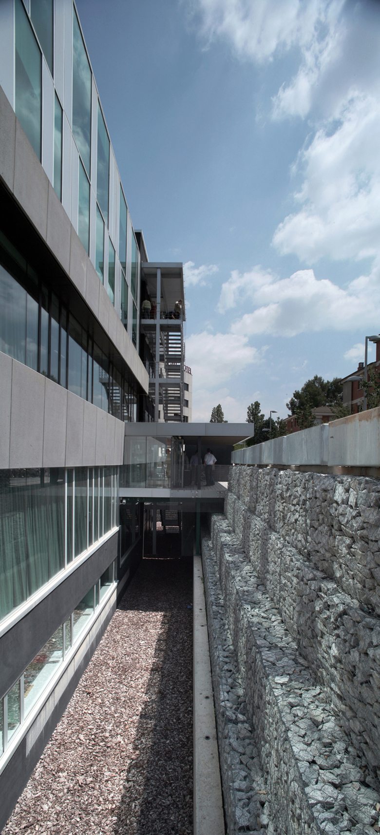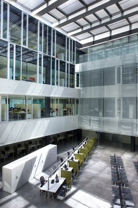 El edificio se organiza alrededor de un patio interior i al mismo tiempo con un entorno vegetal externo formado por abedules, que actúan como brise-soleil de diferentes intensidades estacionales. Este espacio permite interiorizar las zonas de trabajo y abrir todas las dependencias a una ventilación y asoleo controlados, así se posibilita un notable ahorro energético y se reduce el coste del acondicionamiento térmico del edificio.