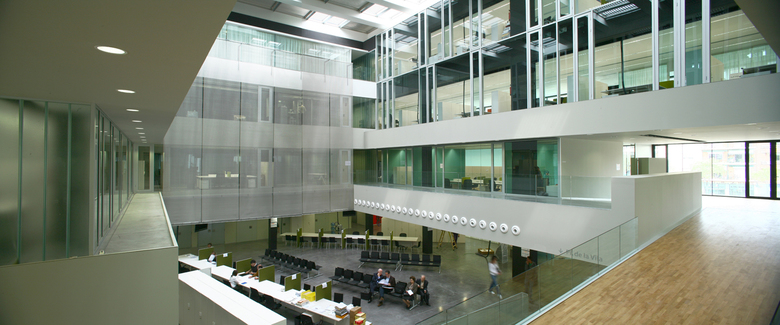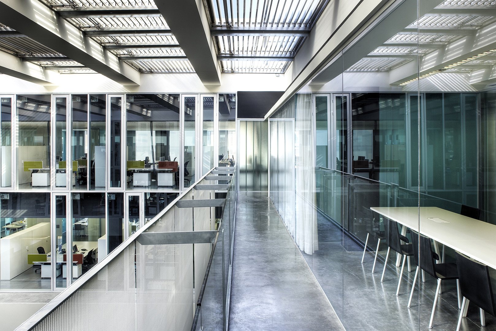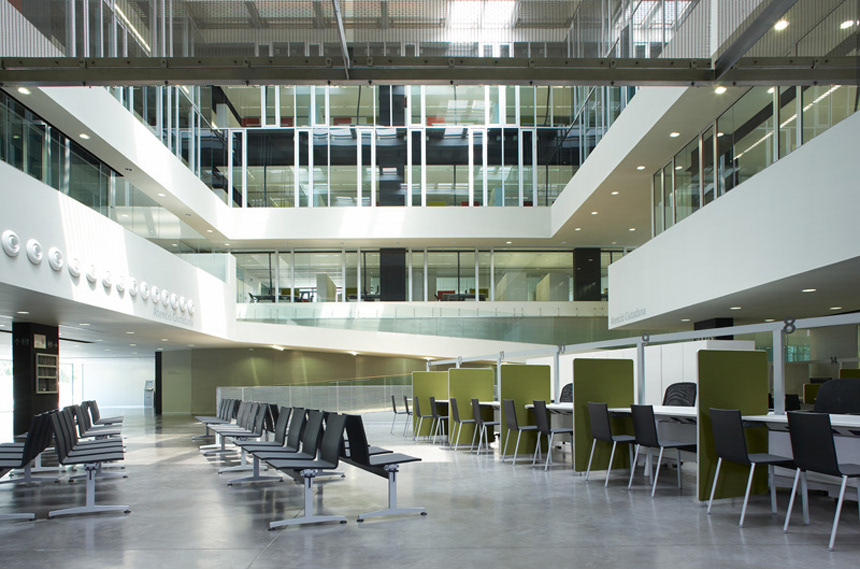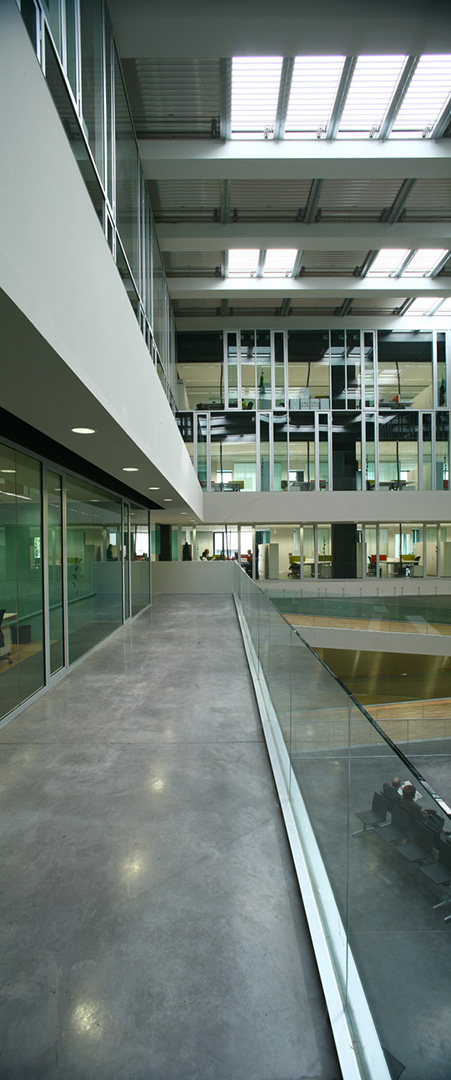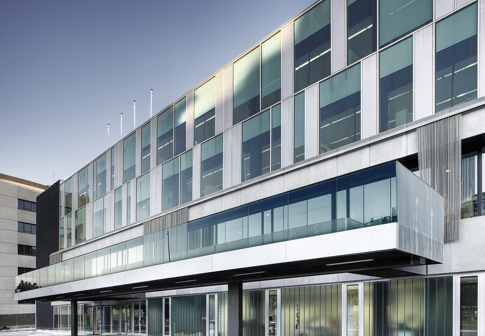 El edificio se organiza alrededor de un patio interior i al mismo tiempo con un entorno vegetal externo formado por abedules, que actúan como brise-soleil de diferentes intensidades estacionales. Este espacio permite interiorizar las zonas de trabajo y abrir todas las dependencias a una ventilación y asoleo controlados, así se posibilita un notable ahorro energético y se reduce el coste del acondicionamiento térmico del edificio.