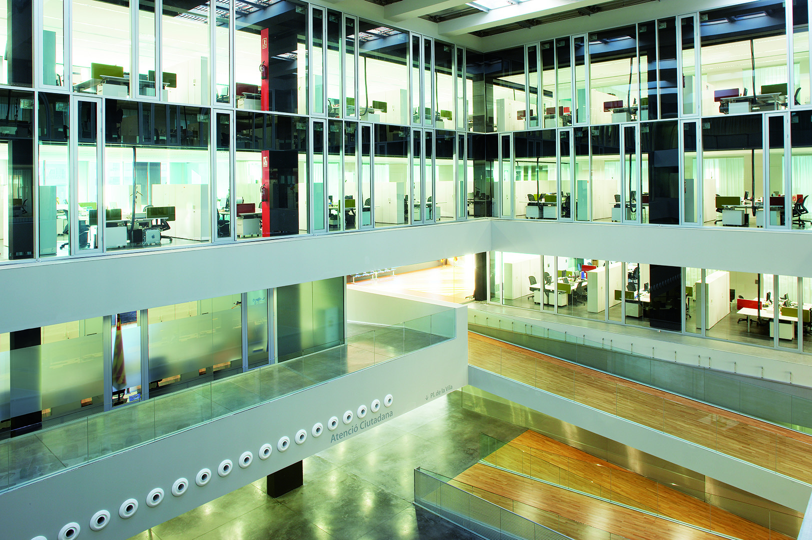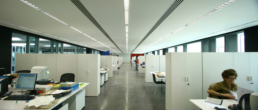 A ver, cito textualmente memoria: “El edificio se organiza alrededor de un patio interior i al mismo tiempo con un entorno vegetal externo formado por abedules, que actúan como brise-soleil de diferentes intensidades estacionales. Este espacio permite interiorizar las zonas de trabajo y abrir todas las dependencias a una ventilación y asoleo controlados, así se posibilita un notable ahorro energético y se reduce el coste del acondicionamiento térmico del edificio.”