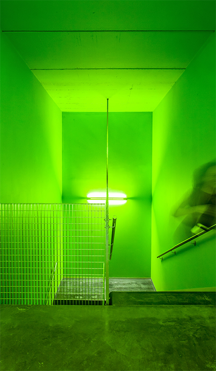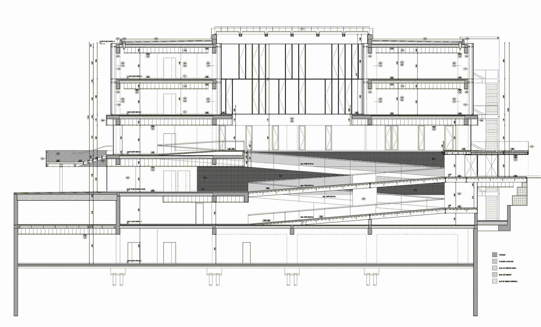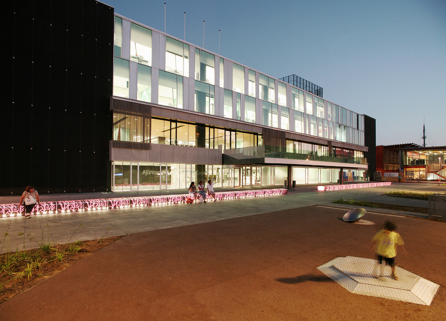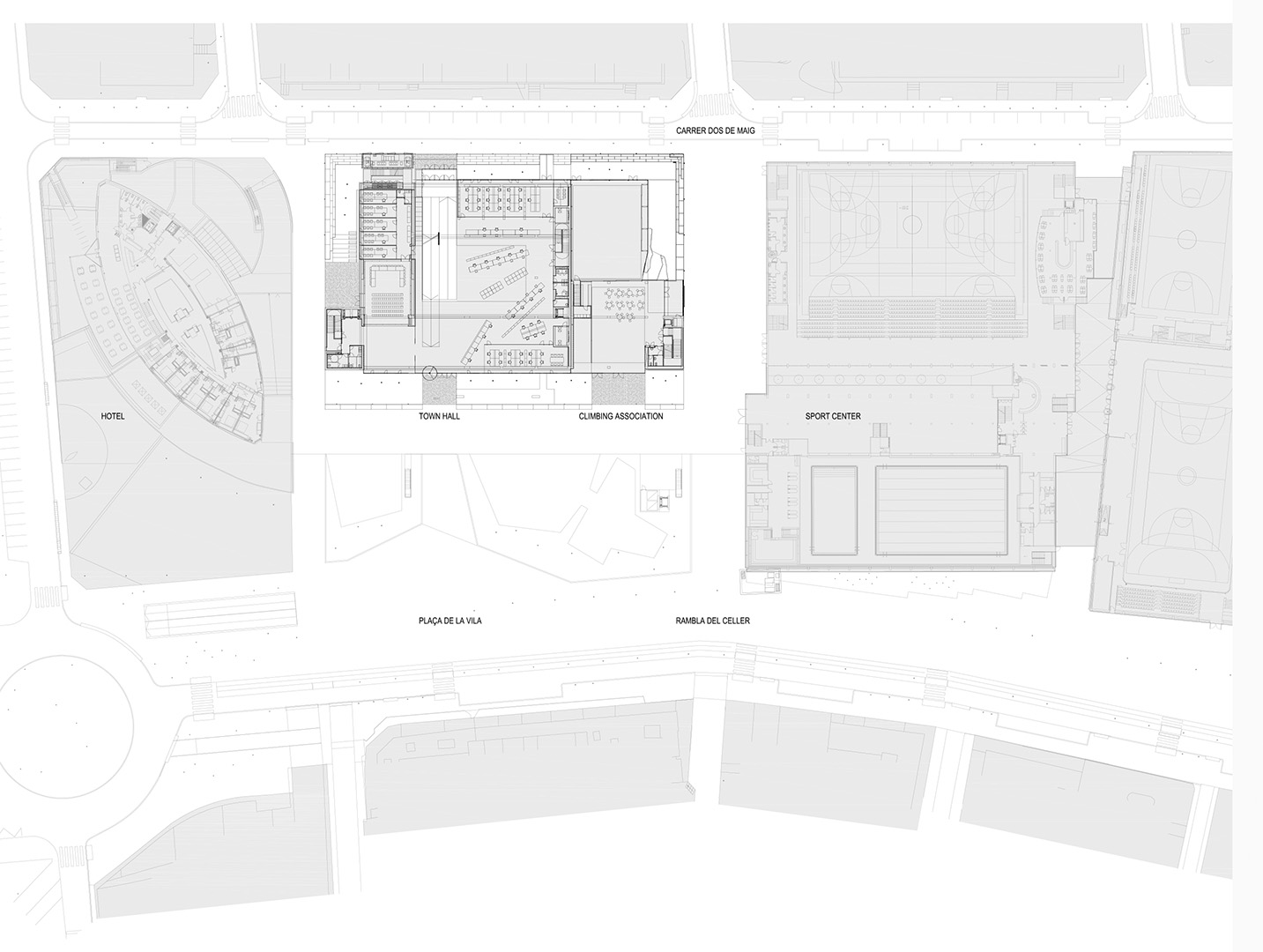 Un recorrido en rampa articula sucesivamente las diferentes partes de programa específico y acentúa las cualidades representativas. De esta manera, la rampa se convierte en una verdadera calle ascendente que cruza el edificio al mismo tiempo que genera una secuencia dinámica de espacios que conectan el vestíbulo, la sala de plens, el hall de atención al ciudadano, la conexión con la calle posterior, el acceso público a los espacios de la alcaldía i, finalmente al balcón del Ayuntamiento, el elemento más emblemático que enfatiza su condición entre límite entre espacio público y edificio.