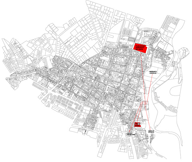 Hay que abrazar a la Ermita de San Miguel. El edificio del mercado, se cortara de tal forma que le genere un espacio de apreciación a la Ermita. Un espacio entre el mercado y la Ermita, para ser rodeada. Le genera una distancia. Al mismo tiempo, el corte del edificio se hace con material reflejante de acero inoxidable pulido, desde donde veremos otras visiones distorsionadas de las partes ocultas de la Ermita.