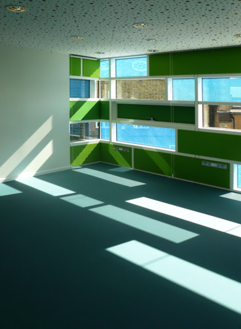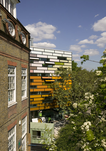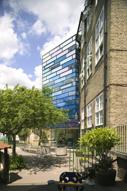 The new building is pulled away from the flank wall to sit closely parallel with the neighbouring (Listed grade II*) Odd Fellows Hall. The resultant in-between space establishes a dramatic new entrance; and a triple height transparent atrium that bridges old and new. Stairs, lift and voids cleverly reconcile four contemporary storeys within the height of three Victorian floors. The classrooms are wrapped in a pixellated loop of glass. The colour spectrum and glazing ‘brick bond’ pattern boldly plays with the scale and materiality of the context. The facade works hard: solid, fritted and clear glass provide environmental control, internal felt pinboards display children’s work, changing views of the city are framed at heights to suit all ages.