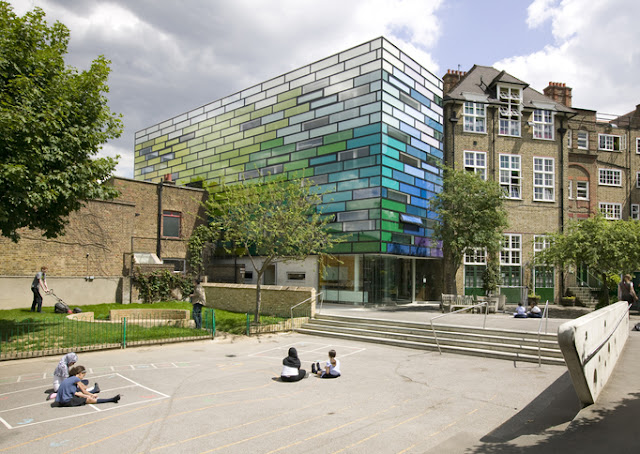 The new building is pulled away from the flank wall to sit closely parallel with the neighbouring (Listed grade II*) Odd Fellows Hall. The resultant in-between space establishes a dramatic new entrance; and a triple height transparent atrium that bridges old and new. Stairs, lift and voids cleverly reconcile four contemporary storeys within the height of three Victorian floors. The classrooms are wrapped in a pixellated loop of glass. The colour spectrum and glazing ‘brick bond’ pattern boldly plays with the scale and materiality of the context. The facade works hard: solid, fritted and clear glass provide environmental control, internal felt pinboards display children’s work, changing views of the city are framed at heights to suit all ages.