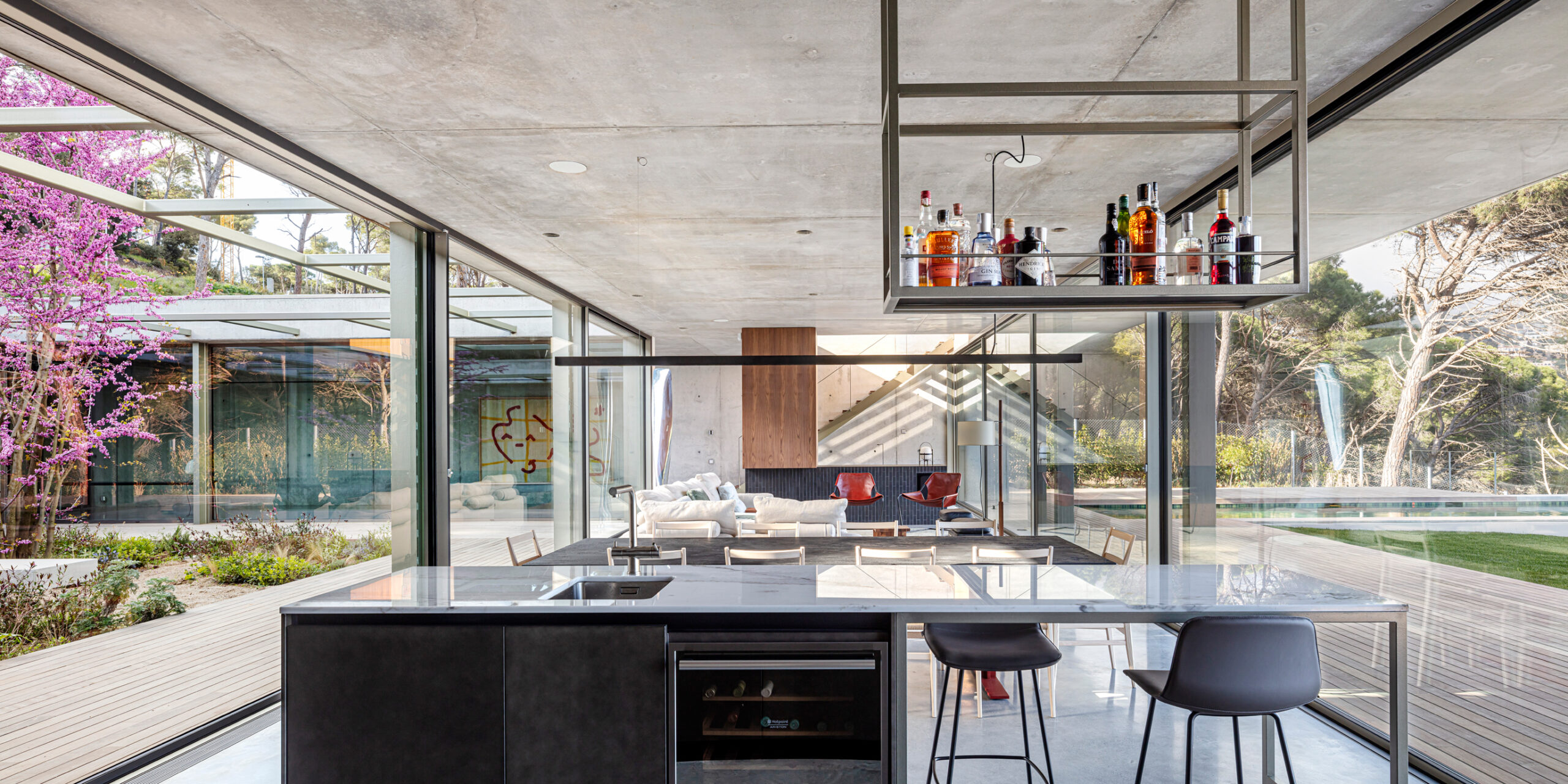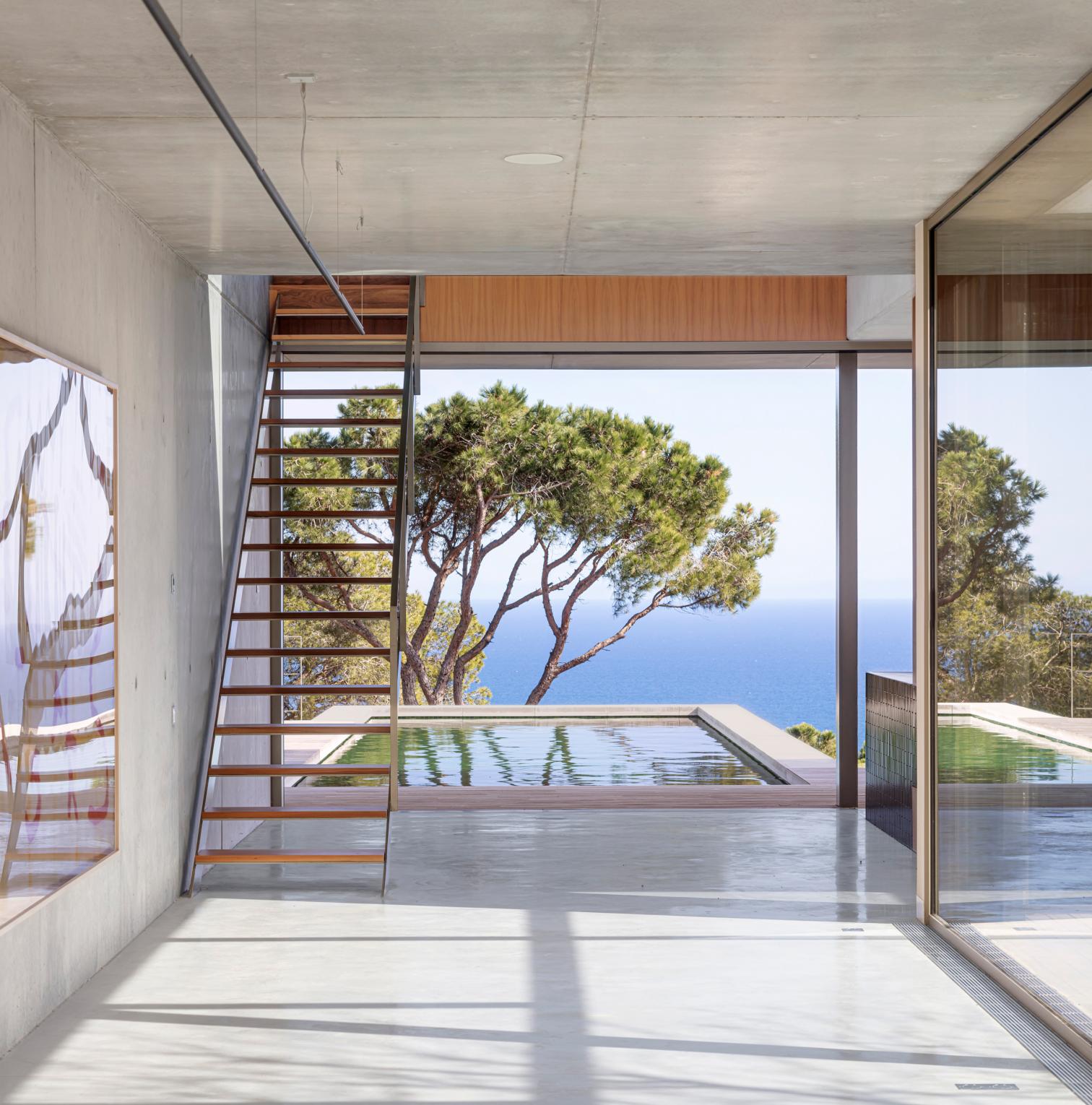 Se alinea con este brazo la piscina desbordante completada por una pérgola que permite realizar una conexión directa desde el exterior al espacio subterráneo: gimnasio y otras instalaciones.