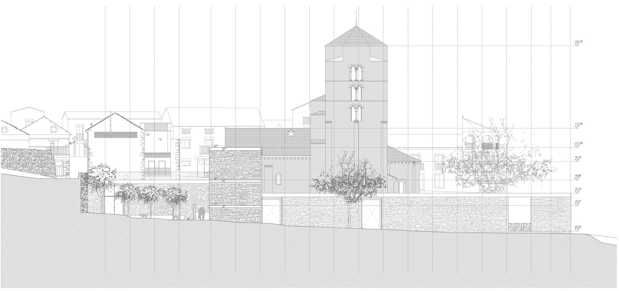 Alberto, muchas gracias de antemano. Contestandote a lo que me preguntas. El proyecto surge supliendo el muro existente, que salva los desniveles entre el solar y las vías colindantes. Es verdad que un pequeños gesto en la zona de museo podría haber caracerizado más amablemente el espacio entre construcción y edificio religioso, pero también existía la posibilidad de competir con el espacio al otro lado de la iglesia, siendo éste la plaza principal de la localidad.