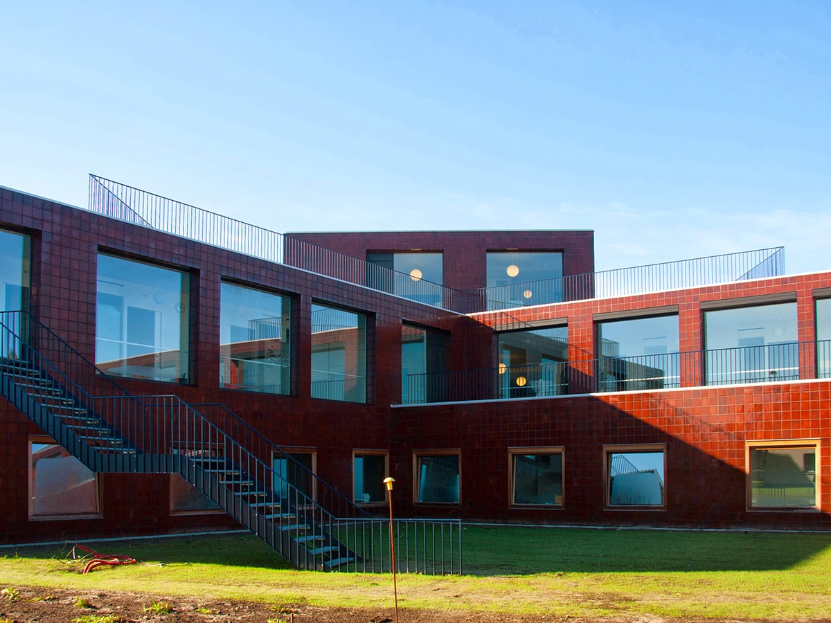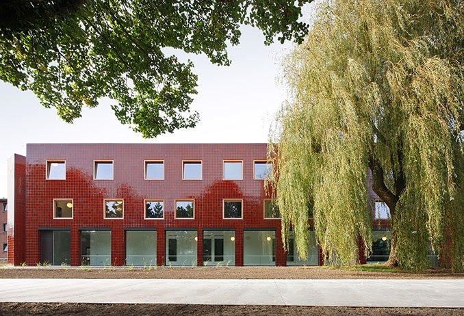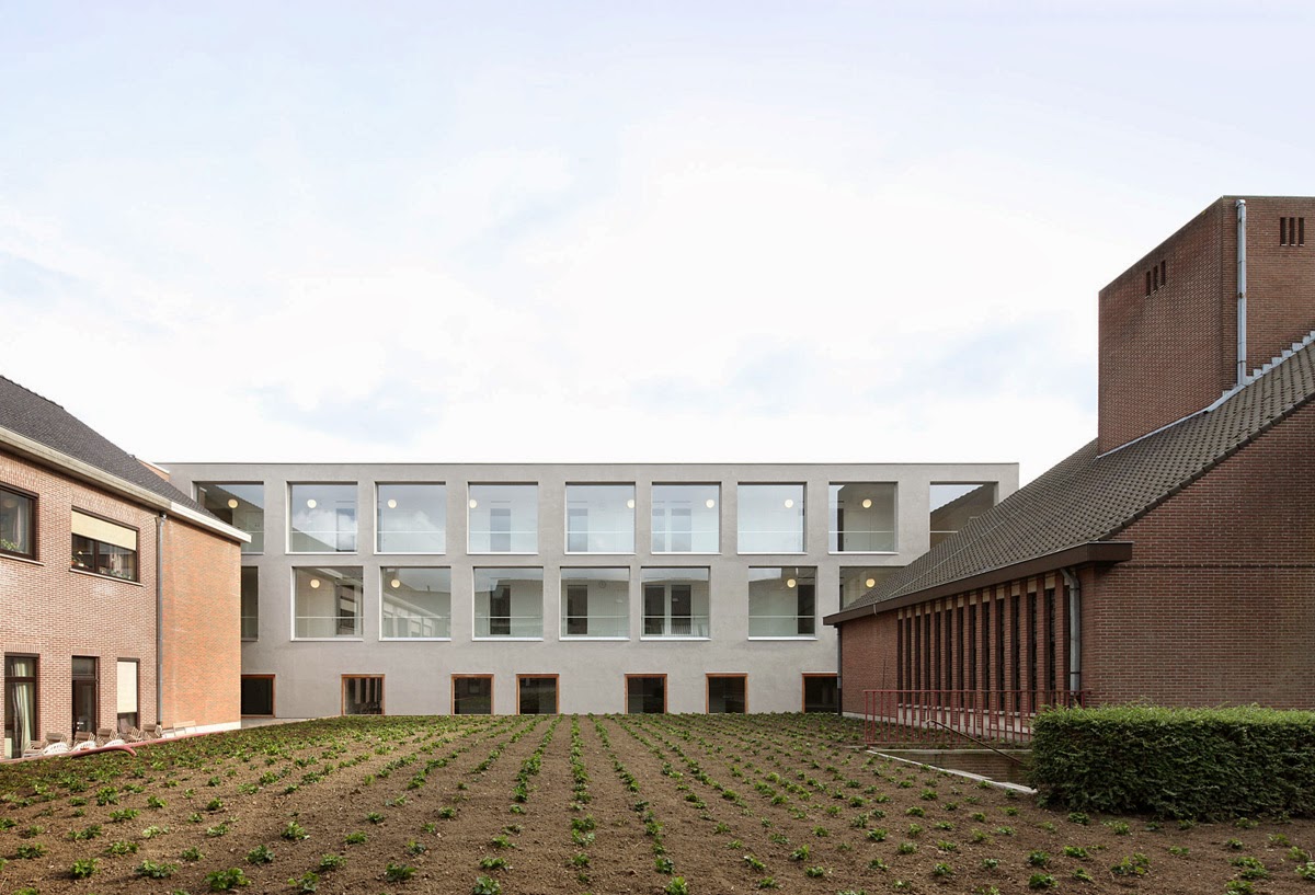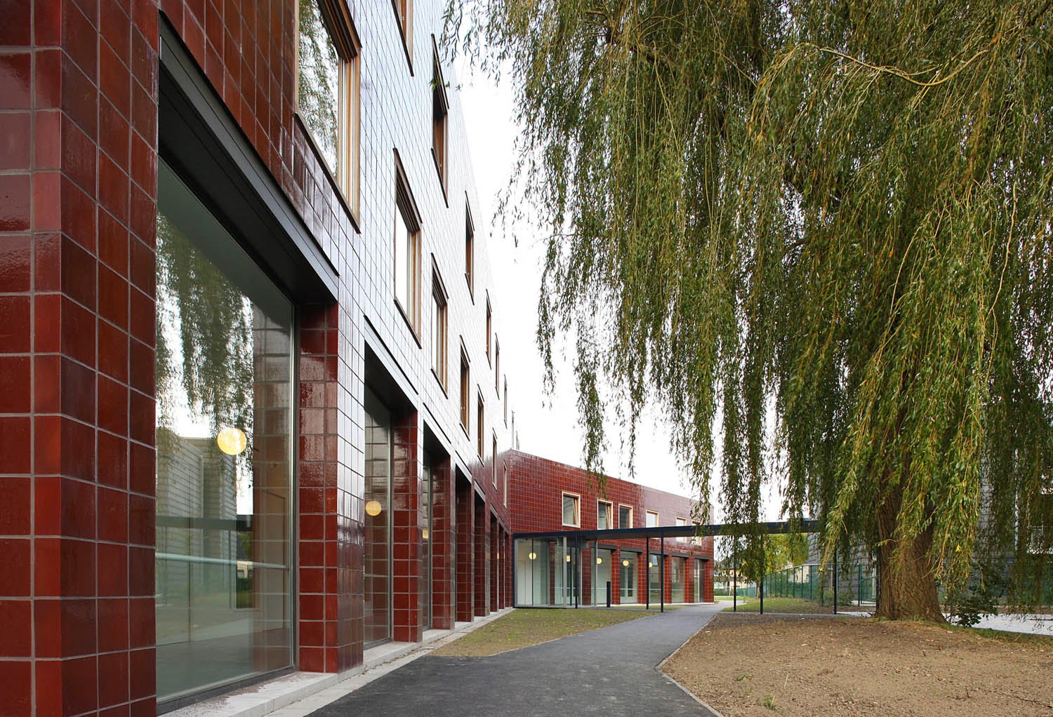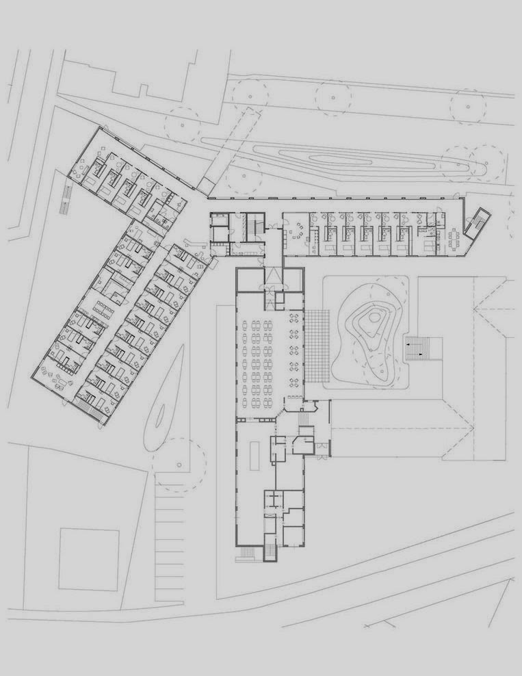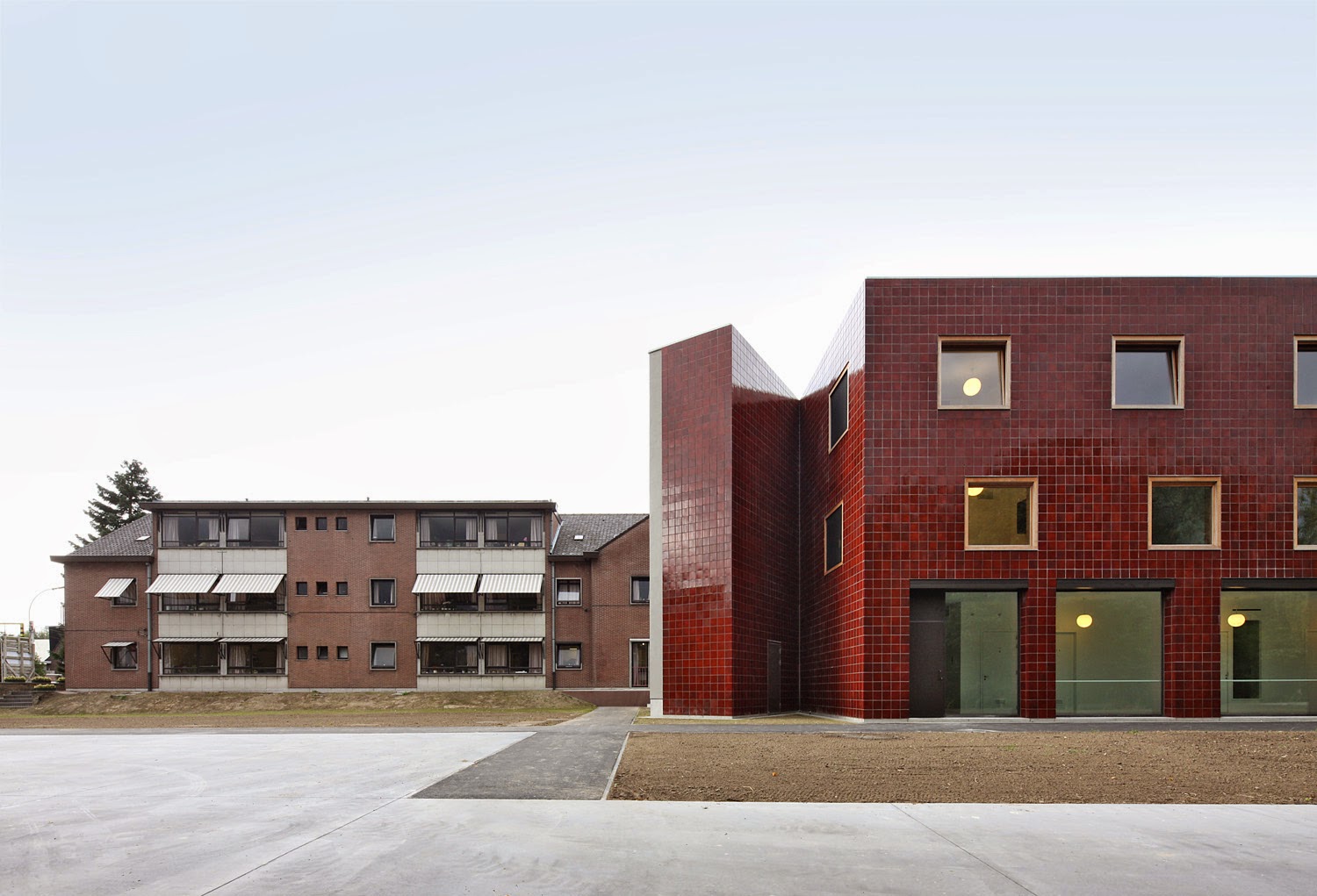 The addition of 54 new care units offers a unique opportunity to complete the – rather haphazard – structure of the original caretaking centre. The first balancing act encompasses the positioning of a 4.400 m² program on a virtual filled up site. By kneading the program into a trident volume a complete new range of possibilities arises, such as the upgrade of the gardens around the premises into autonomous yards, instead of residual patches of green.