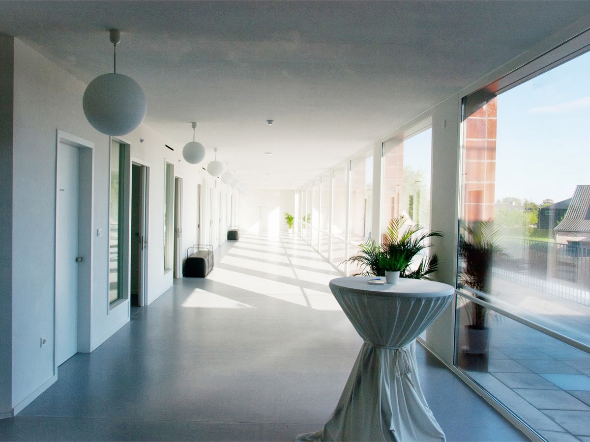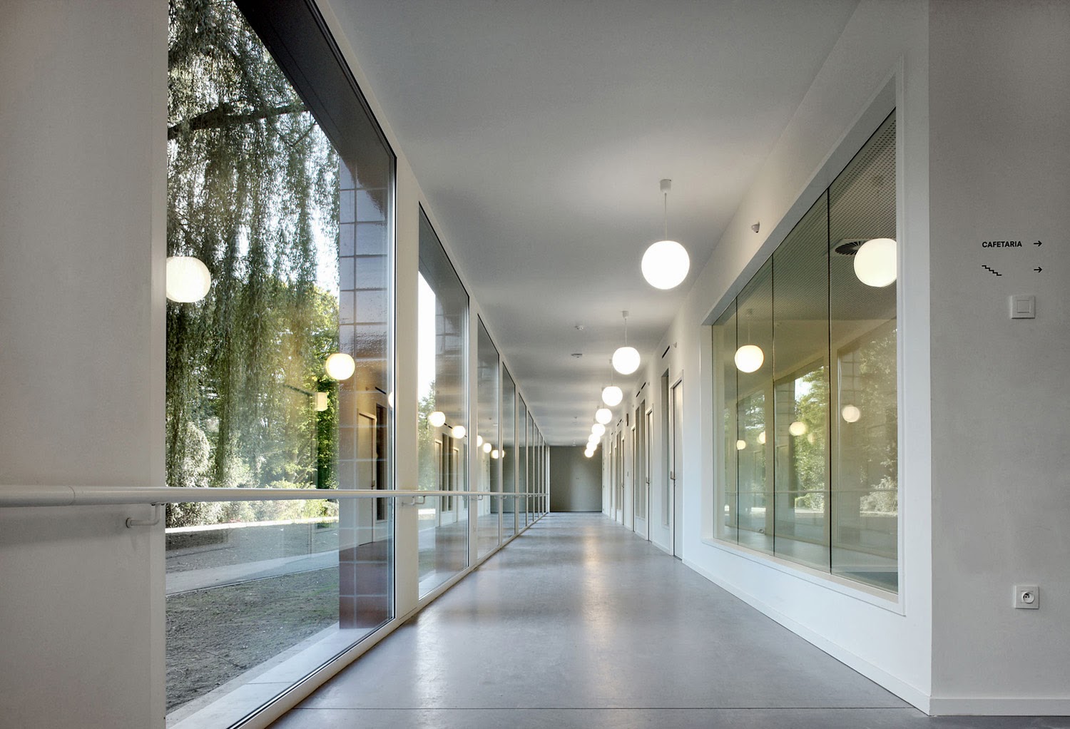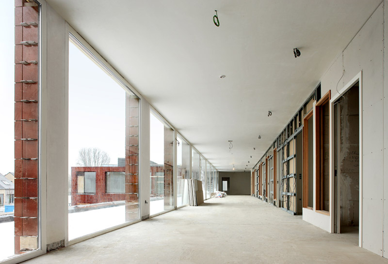 The generously open facades enable patients and staff to fully enjoy the gardens around. Inside, an open network of over-scaled hallways leads to the different living quarters. Wanting to avoid rooms which could be typecast as ‘caretaking rooms’, we proposed to double each room, offering both a living space and a bedroom area to patients.