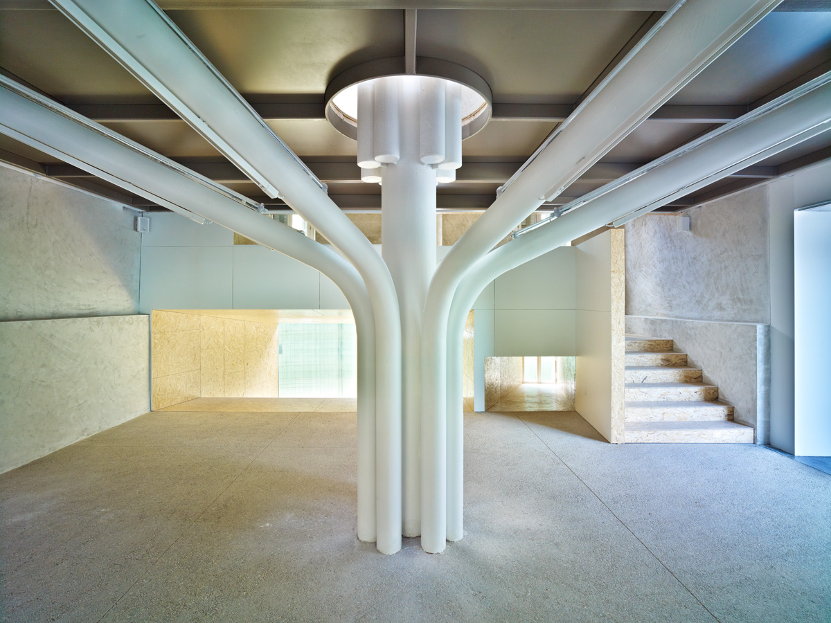 El antiguo espacio doméstico de pequeña escala de la casa Gurbindo es reemplazado por espacios diáfanos organizados alrededor de un árbol de acero que busca el lucernario piramidal existente en el punto más alto de la cubierta a cuatro aguas a la vez que se constituye como la nueva estructura de soporte de la casa junto a los muros.