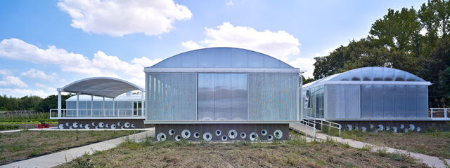 Una instalación propia de geotermia permite intercambiar calor y frío con el agua del río a la vez que las cubiertas captan el sol en invierno calentando el aire, o se levantan dejando la cámara de la cubierta abierta para ventilar en verano. De la misma manera que los invernaderos cercanos, ambos sistemas buscan la máxima autosuficiencia energética.