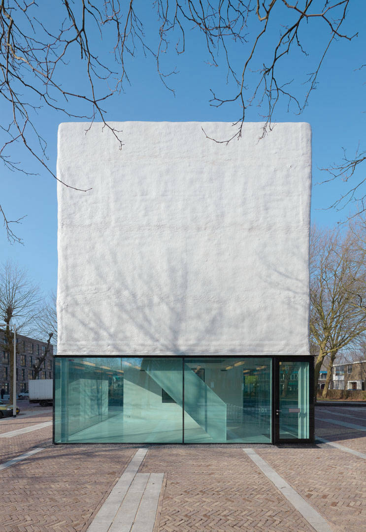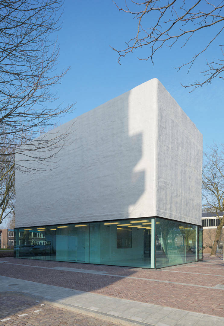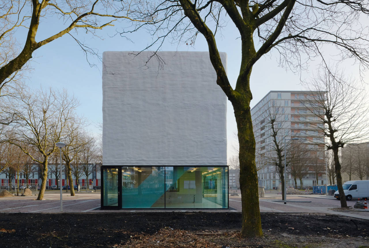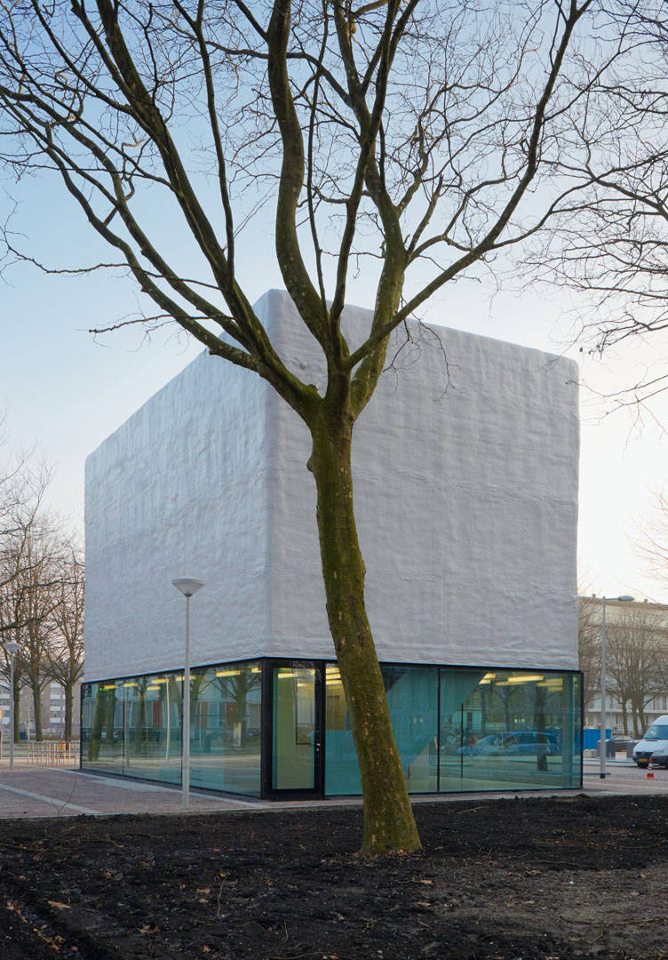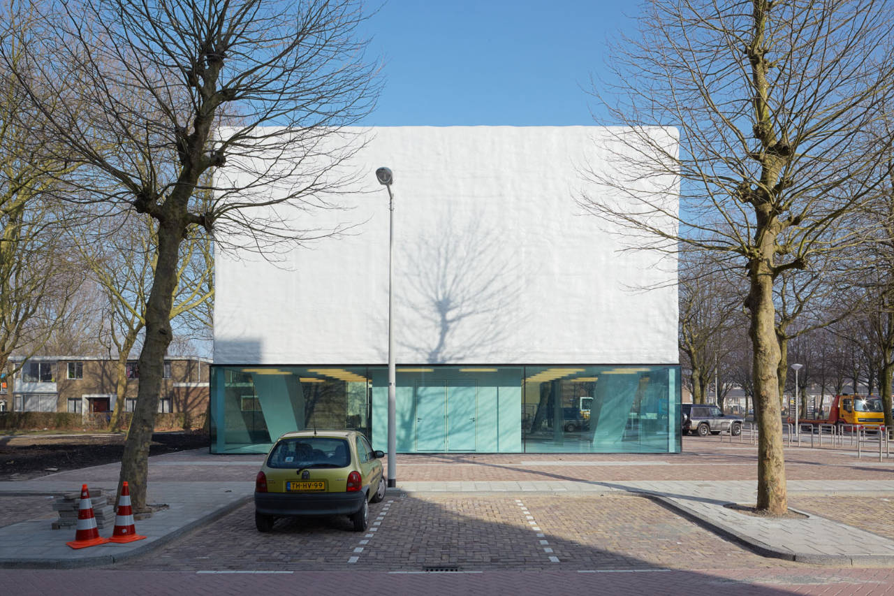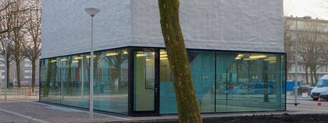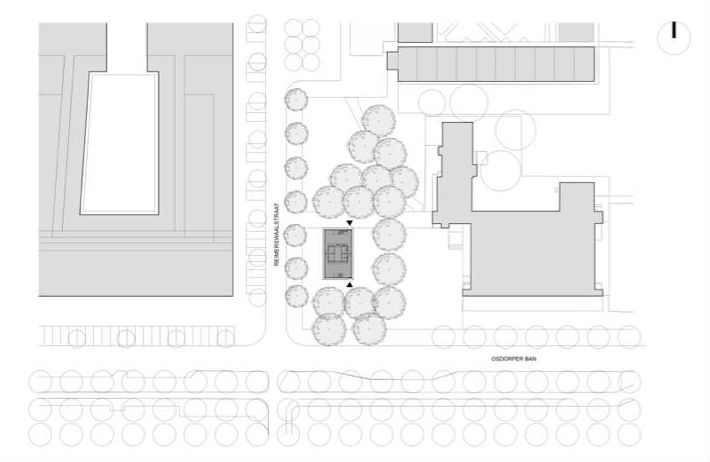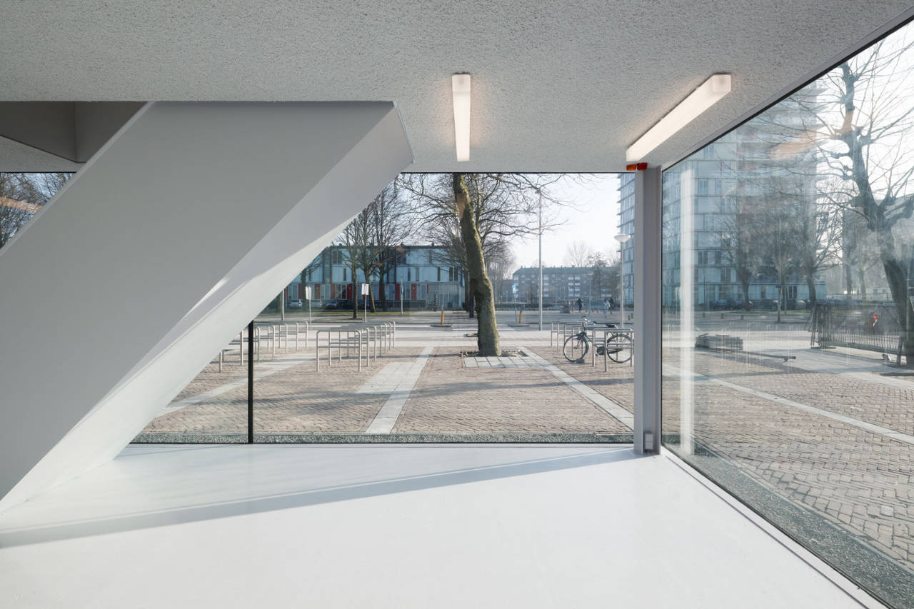 In 2005, Atelier Kempe Thill won an invited competition to construct within such an area of the „Reimerswaalbuurt“ a small youth- and neighbourhood centre. The task was to integrate the small building as carefully as possible in the existing tree population, to keep enough distance to the adjacent building blocks and to design a monumental, polydirectional and well visible free-standing building.