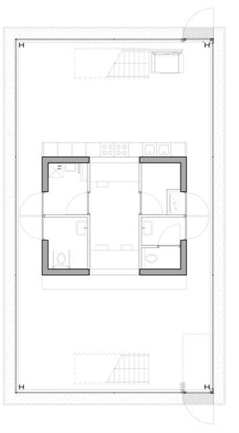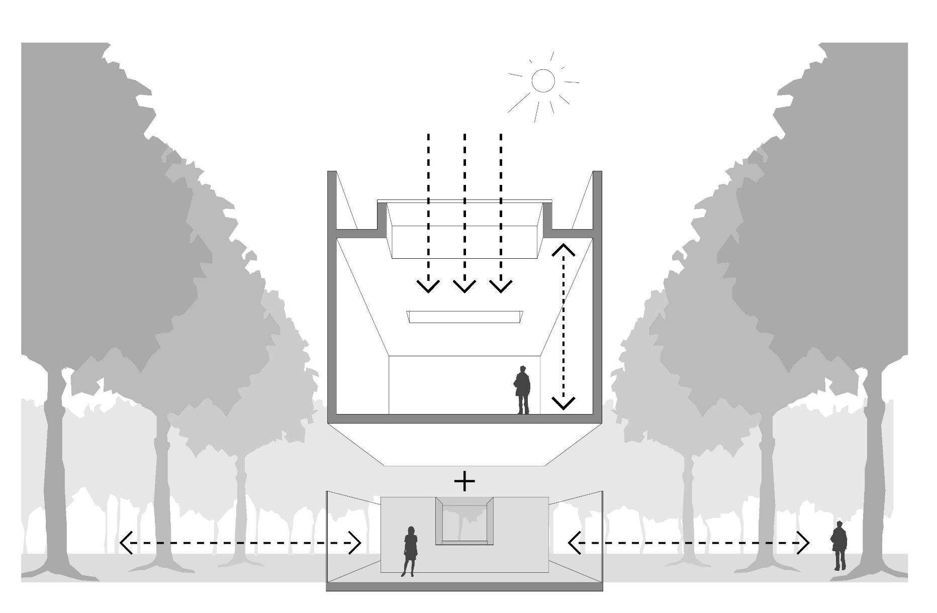 The realized building consists of the simple stacking of two – diametrically opposed – concepts of space. The ground floor level is designed as a flat sandwich-space, which opens up completely to the surroundings thanks to the glazing on all sides. The public green with its dominated tree canopy becomes part of the interior and generously extends the small space to the outside. This effect is enhanced by the modest interior design and the greyish colour scheme. Used as a “public living room“ of the neighbourhood, activities on the inside are well visible and stimulate the direct interaction with the public space.