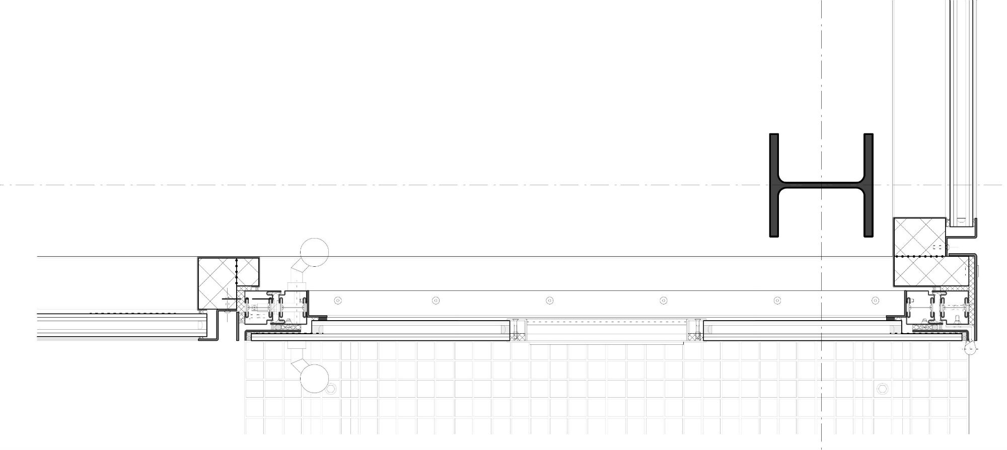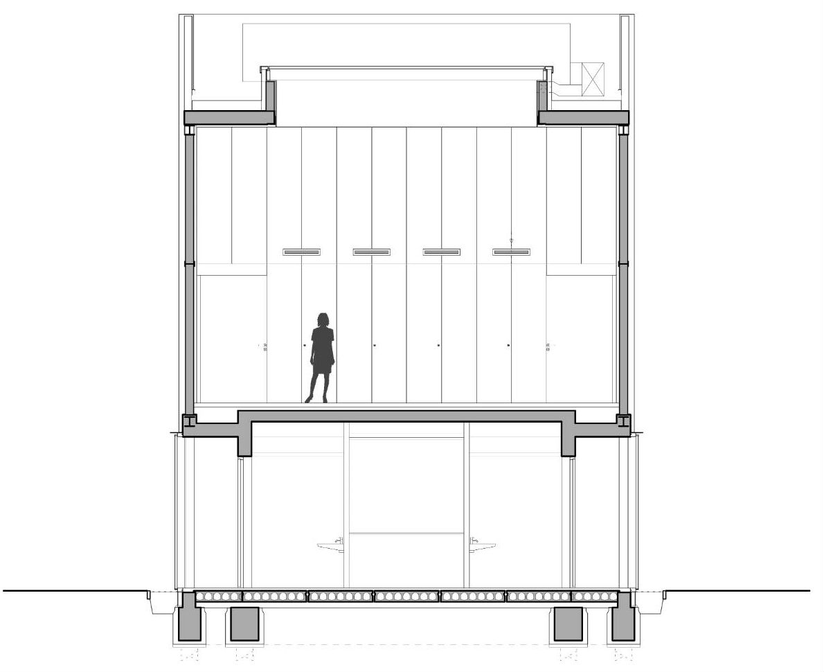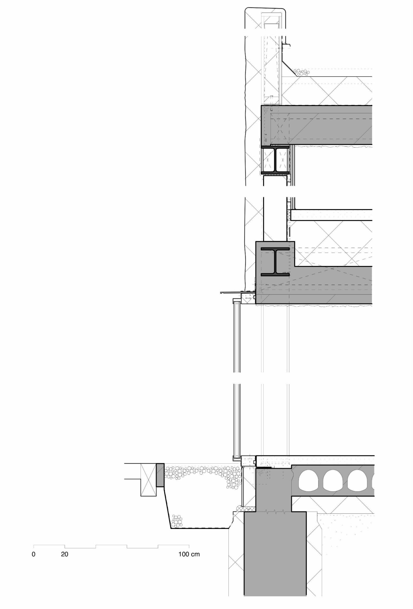Like a cheap industrial compound, the building is made of a steel frame structure with a wall infill of sand-lime brick. All technical installations are integrated in the walls and the floors, so no lowered ceilings where necessary, which contributes to higher rooms. The glass facade is made from an inexpensive all-glass system, which uses large glass pannels up to 5 meters in length, clamped only on two sides with a 5cm high steel profile. The structural glazing doors were specifically designed for this project. A polyurethane spray system was applied for the closed part of the façade that normally is used in the insulation of oil tanks and pig shed. The insulation is sprayed onto the sand-lime brick in liquid form and froths up on-site. Then, the very rough surface is finished with an UV protective coating.