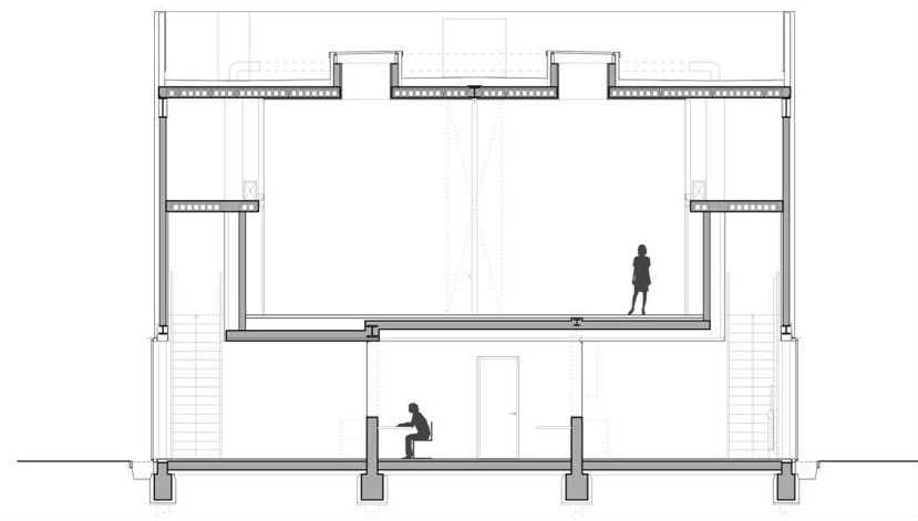 The interior is governed by a similar economic and creative approach. The slightly rough concrete floor is only coated with a layer of polyurethane; the ceiling is covered with an acoustic spray plaster. Contrarily to this, large reflective interior glazing, smooth industrial lights and two elegant steel staircases were installed.