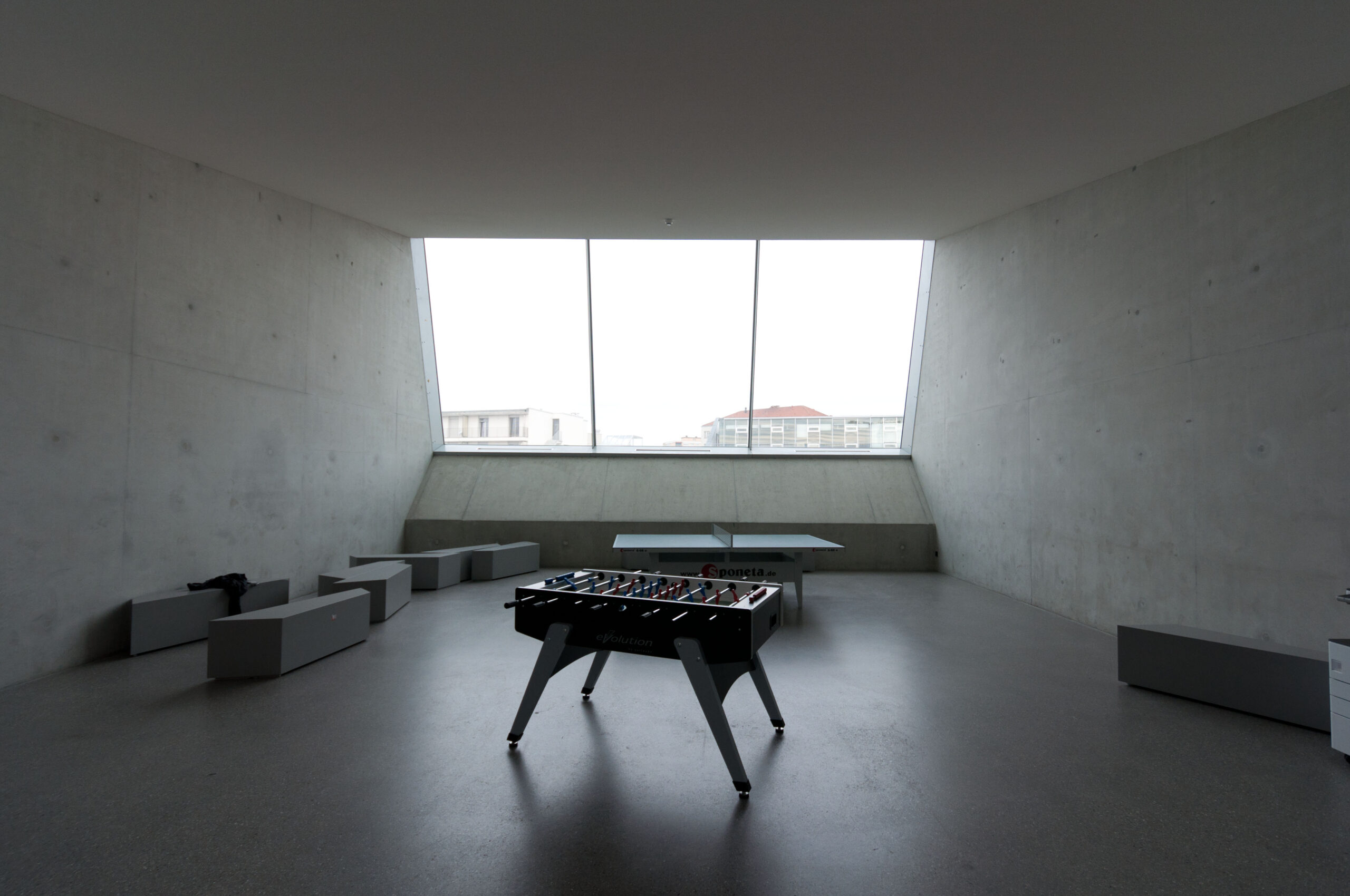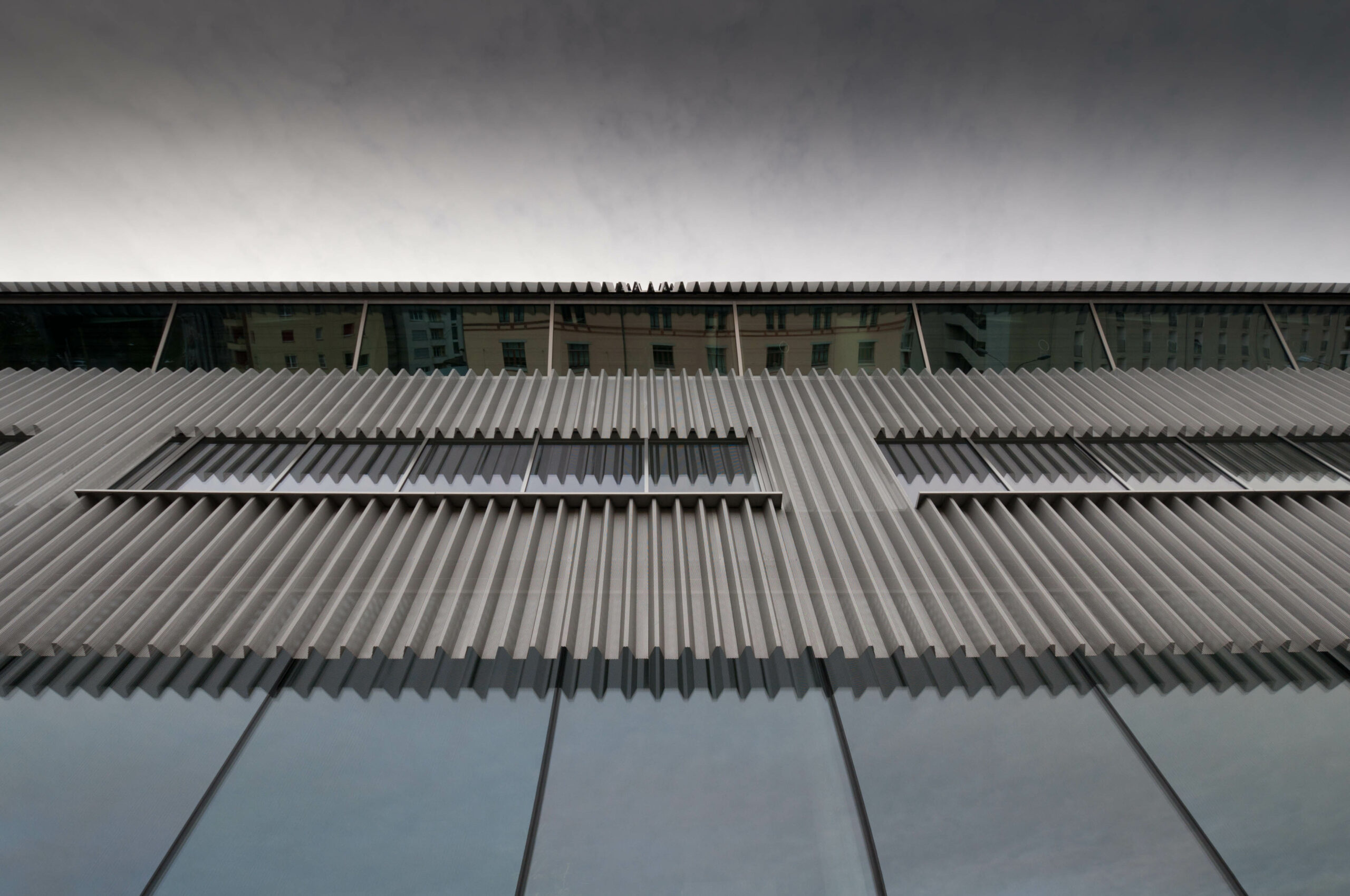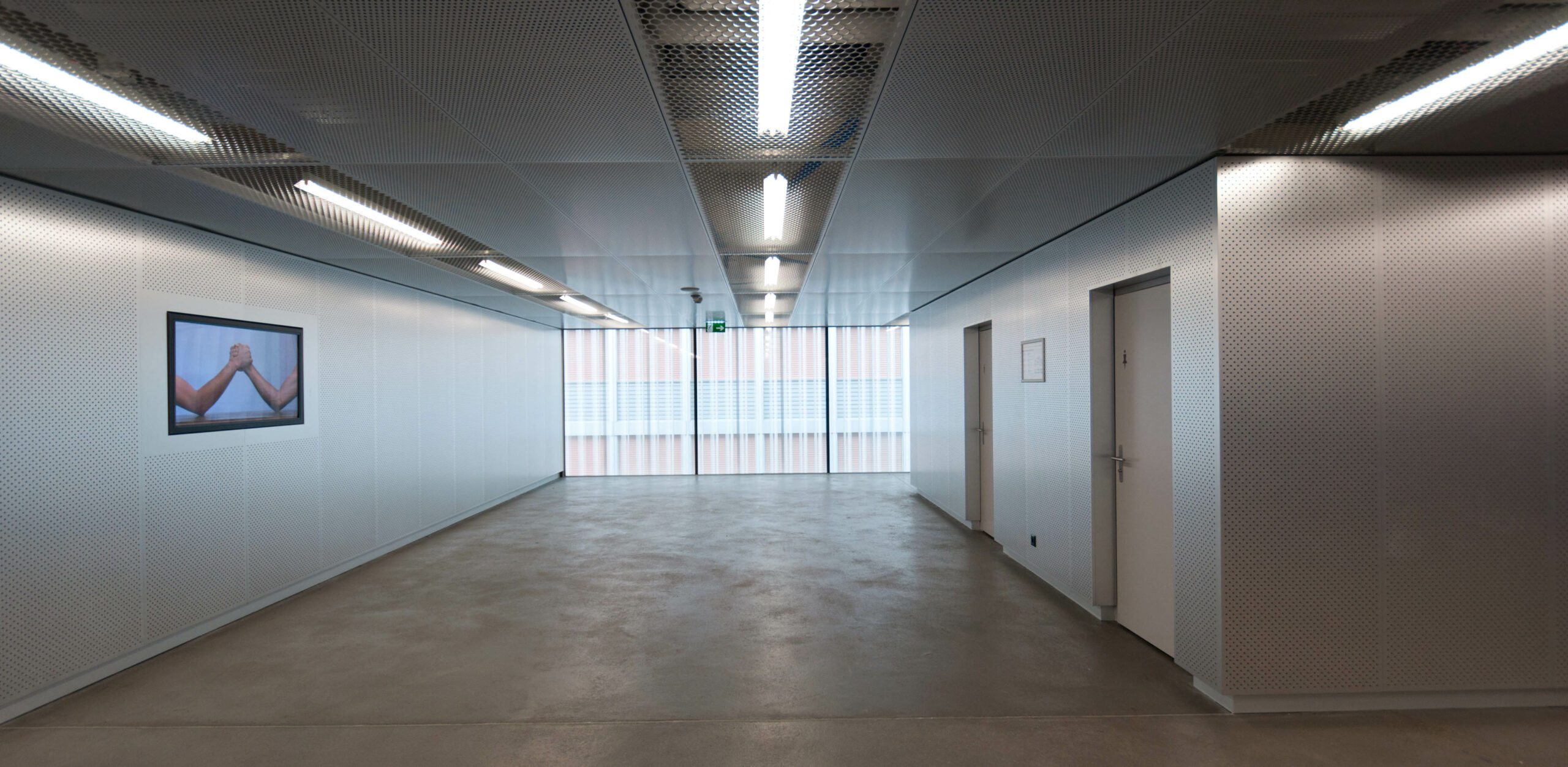 The ground floor of the Ecole des Métiers (EMF) shows up as a glazed strip that provides insight and reflects the cars. The upper floors disappear behind a perforated aluminum skin, something almost like a brutal act, however the bare ends of concrete, put an abrupt end. The only “reading” on the infinite facade is the three windows set on the top floor.