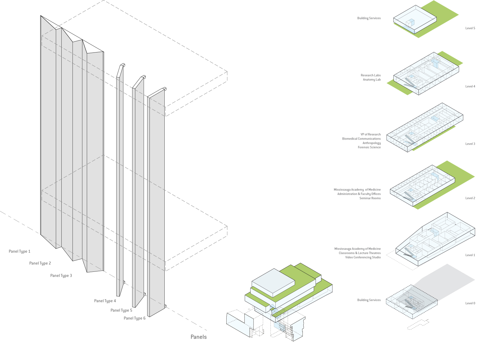 The functional programming of TDHSC supports three primary user groups: the new Mississauga Academy of Medicine, the Department of Biomedical Communications and the Department of Anthropology and Forensics. The program at TDHSC includes video conference-ready lecture theatres, classrooms, seminar rooms, faculty and administrative offices, and instructional and research laboratories.