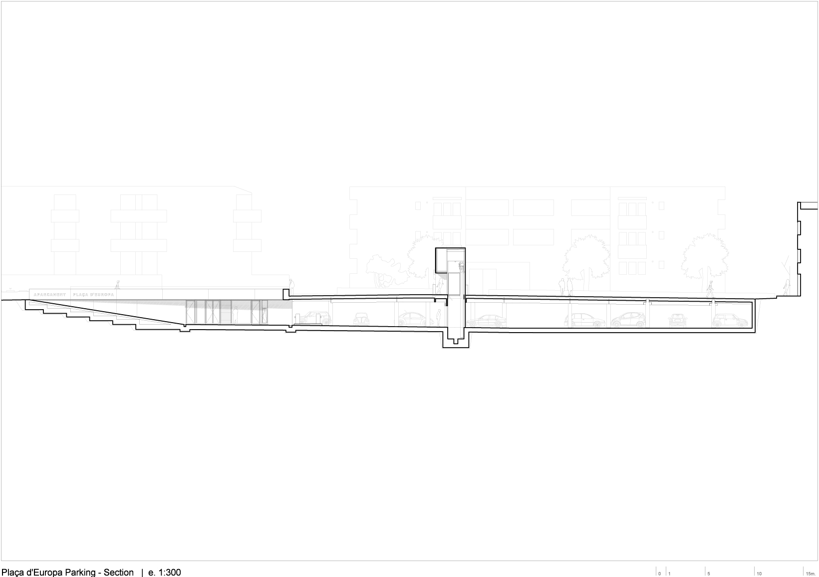 Con el objetivo de liberar de la presión del tránsito rodado para su uso peatonal en la totalidad de la superficie de la Plaza de Europa, se ha desarrollado un edificio de 3018 m2 completamente enterrado cuya cubierta conforma un espacio público.