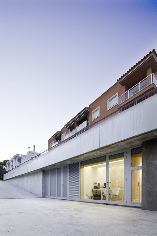 En la materialización del edificio predomina claramente un único material, el hormigón, puesto en obra de diferentes maneras: in situ (losa de cimentación), prefabricado (pilares, forjado, piezas especiales de remate, maceteros y muros de contención), en pequeñas losas (pavimento de la rampa de acceso) y como panel composite (revestimiento del núcleo del ascensor y parte de la fachada de acceso).