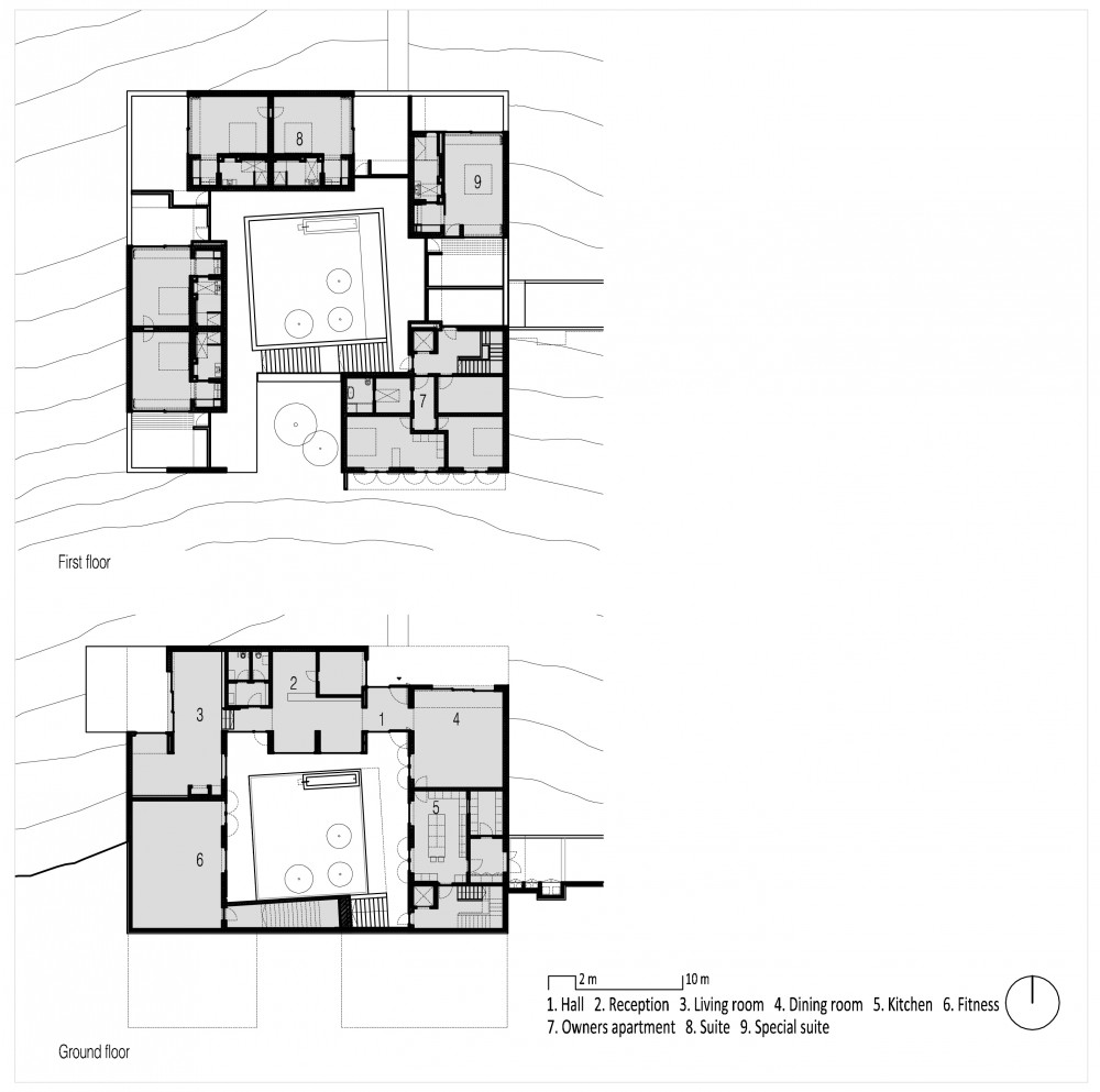 Las habitaciones se orientan individualmente a un patio privado a través del cual también se produce el acceso. Encerrado en el silencio que le proporcionan las paredes forradas con corcho, al aire libre, estos espacios se benefician aún de una vista enmarcada y panorámica del paisaje circundante a través de grandes aberturas horizontales.