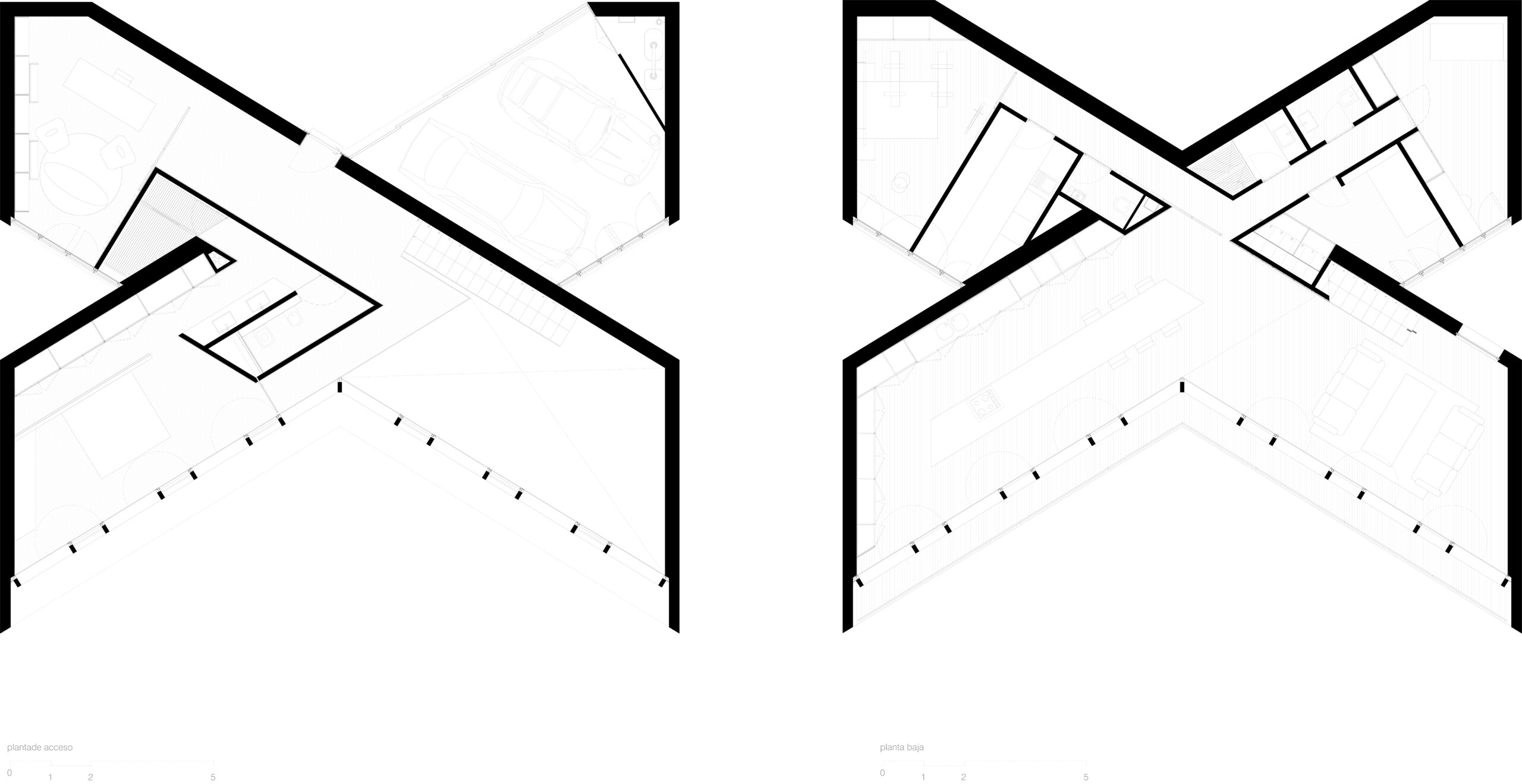El proyecto de la casa X busca resolver mediante un sistema, un lenguaje, una forma única, una multitud de interrogantes que se plantean al habitar específicamente el terreno dado: como proteger y dar protagonismo a un pino de dimensiones y apariencia impresionantes que se encuentra en la parte alta del terreno, y que dificulta cualquier acceso y acercamiento directo a la vivienda desde la vía de acceso; como no tomar partido entre las vistas al mar y las vistas a la montaña, y permitir ambas visiones en direcciones opuestas; como neutralizar con la forma la presencia de las casas contiguas, para construir una asilamiento ficticio respecto a los vecinos; como duplicar las vistas principales, permitiendo vistas de calidad a la parte frontal pero también a las estancias de la parte trasera de la casa; como resolver tantos aprioris con un simple movimiento que de respuesta a todas y cada una de estas voluntades sin explicar ni priorizar ninguna de ellas. La forma, una forma única, englobadora y muy medida, es el resultado de un largo proceso de búsqueda a respuestas individuales a cada uno de estos desafíos. La forma no es pues un a priori, sino un esfuerzo por dar una respuesta unitaria que satisfaga cada uno de los diversos interrogantes planteados.