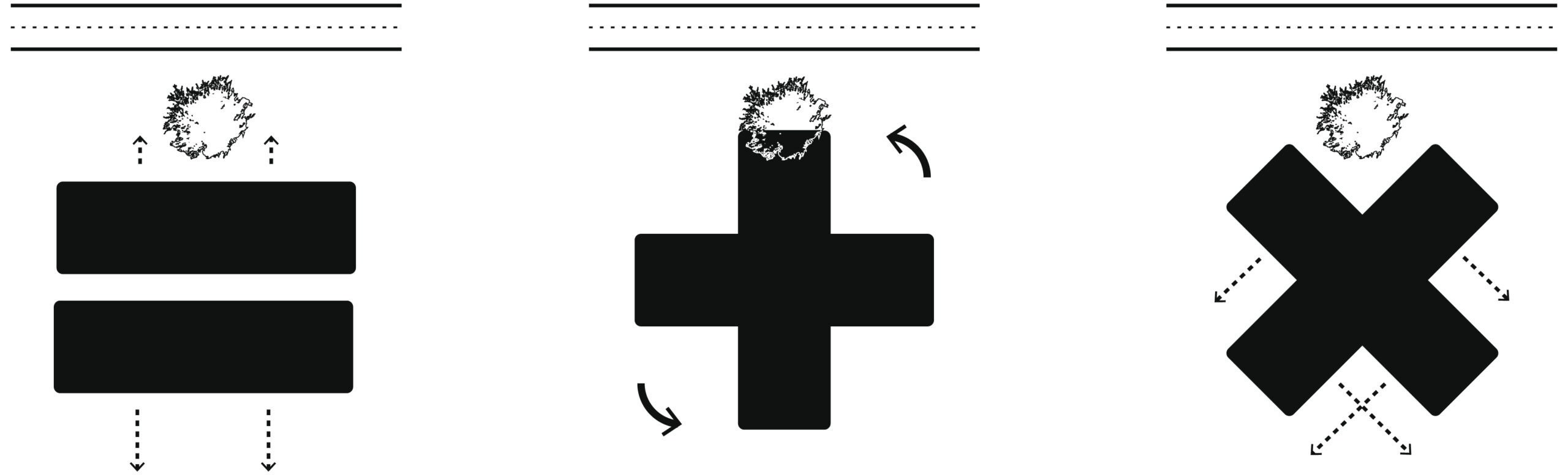 1. augmentar la pell de l’edifici per permetre que els espais que podríen haver quedat constrenyits esdevinguin exteriors a través del desplaçament dels volums,