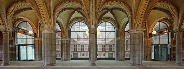 El edificio fue diseñado en 1885 por Pierre Cuypers como si fueran dos edificios en uno, separados solo por un pasaje central situado en la planta baja, por el que circulaban las bicicletas.