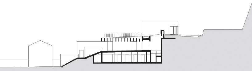 The peculiar sloping site is located between two parallel roads, one in front of a cemetery and the other servicing a shopping mall, with an old villa at the lower end of the lot. The ‘children’s day care center’ in la trinite, france by local studio CAB architectes finds its home nestled deep into the topography and exposes the slope through the architecture, serving as a child care facility and a sculptural urban walkway connecting both extremes. The concrete foundation is composed of a large retaining wall in the shape of an L along the backside of the site, bending to accommodate the pathway. Three perpendicularly placed inhabitable cores help delineate the interior spaces and house all the service functions as well as support two floor planes that cantilever three meters out over the children’s playgrounds on the respective lower levels. The roof is made up of a scaled-up concrete louver system like a large pergola over the entire program, allowing the right amount of indirect light to pass through the full-length lateral skylight and bounce off of the triple-height back wall into the corridors. all the rooms and social areas are carefully planned between strategically-placed vertical elements that frame specific views to the south over the town. Parking is left on the same level as the rooftop plane to help lower the cost of construction, and creates a stronger effect as visitors descend into the edifice. warmer wood flooring and fixtures contrast the hard character of the concrete, ideal for softer spaces for kids to play and learn in.