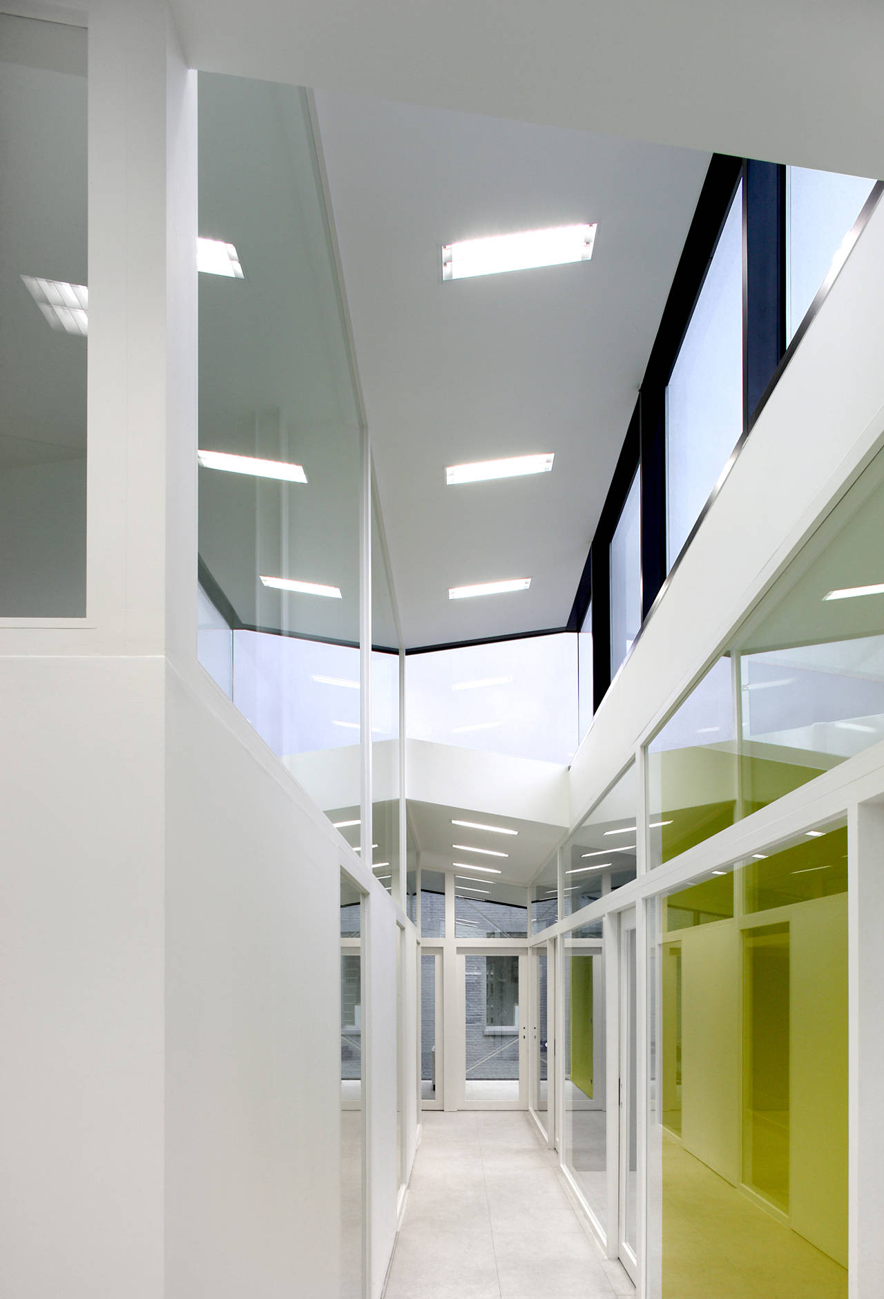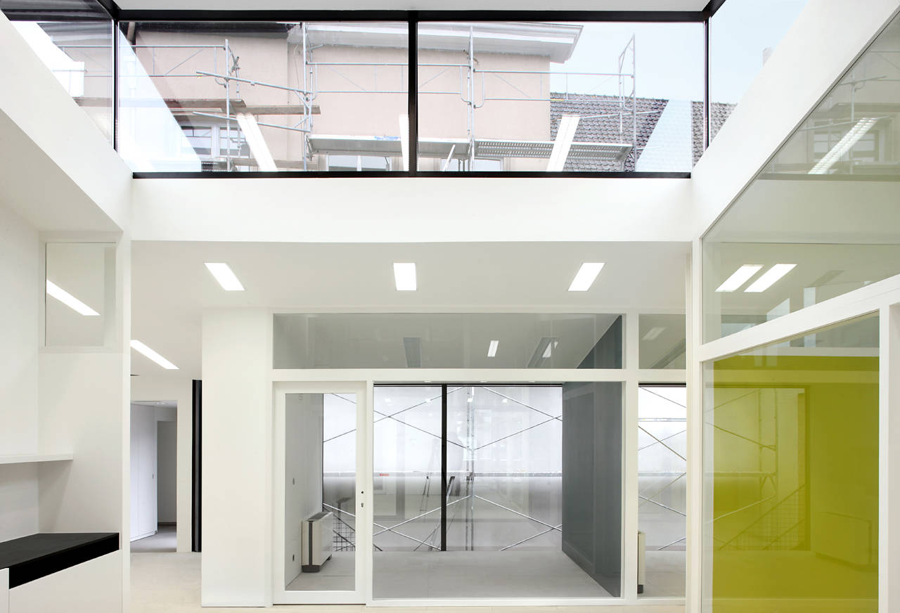 All offices are regrouped in a new volume, which is located on the existing parking lot. On demand of Dexia everything is organized on 1 level, which results in a clear scheme. The internal circulation of the extension with the corner building and the existing part with non-public functions, is organized through the connection volumes.These make it possible to visually disconnect the existing with the new structure. This creates a solitude building with its own identity that is in juxtaposition with the two existing wings. This results in intermediate spaces that allow light and space to enter.