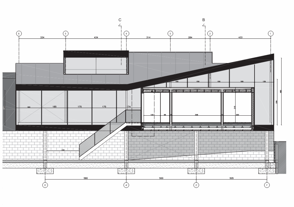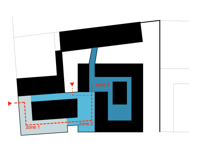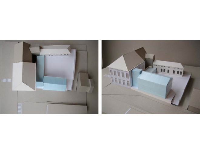 The pitched roof ,obligatory by local urban rules, is cut so that sufficient light can enter the center of the building. Due to the severe slope and by gently lifting up the building, it was possible to create a new parking of 15 parking places.