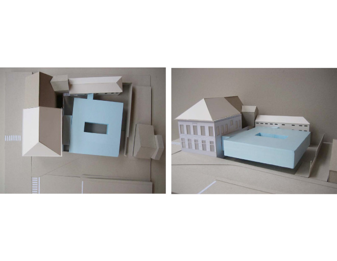 The existing corner building, a protected city view, is preserved and renovated. Itbecomes the main entrance to the bank facility. On this zone a ATM-zone is installed. The first level keeps its program as apartment.