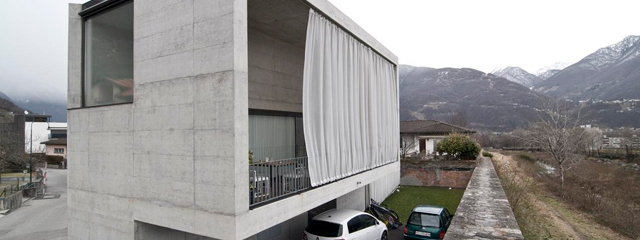 L’appartamento principale occupa il primo e il secondo piano. Il muro del fiume è visivamente scavalcato e lo spazio si apre, attraverso la terrazza in doppia altezza, sul suggestivo paesaggio antistante. Le particolarità del contesto non permettono tuttavia al progetto di intrattenere un rapporto esclusivo con il fiume e la sua arginatura. La facciata rivolta verso la strada è disegnata da una grande apertura che, appoggiata al suo asse di simmetria, si apre verso la montagna. In questo modo si crea un fronte strada che orienta l’intero volume sullo spazio pubblico.