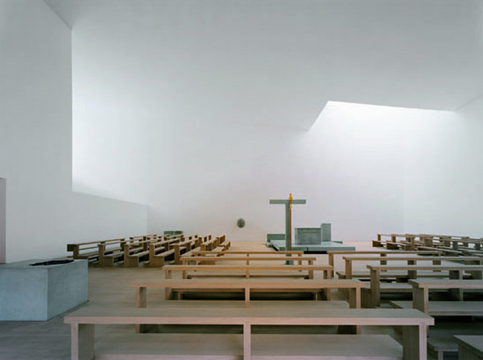 La luz tiene una gran juego de luces y sombras. El interior del edificio se caracteriza por las habitaciones bien proporcionadas con densidad diferenciada y el concepto espacial subrayando iluminación. Las paredes lisas, blancas por dentro son la razón de la luz y de la tranquilidad, lugar elevado para la liturgia.