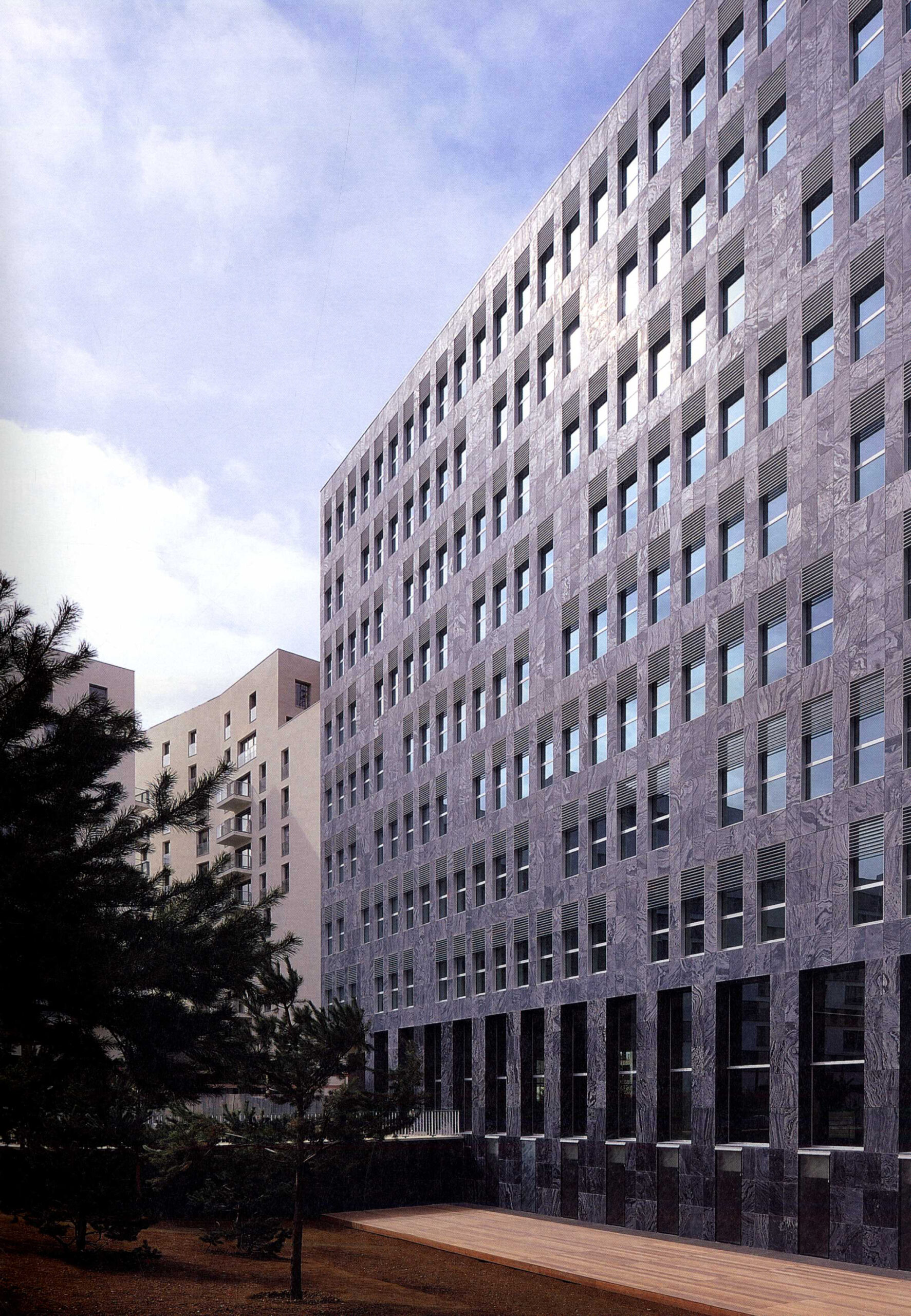 Tras la celebración del concurso la amplitud de los condicionantes impuestos por la normativa y por los agentes intervinientes en el proceso, se interpreta a través de de un edificio sobrio y sencillo. La planta libre producto del núcleo central de comunicaciones lleva la estructura a la fachada que queda recubierta por piedra filita plateada y ventanas y cuadros de aluminio anodinado. El conjunto pétreo se recorta en un voladizo en planta baja y en el recorte del ático en el lado opuesto facilitando el acceso al patio interior.