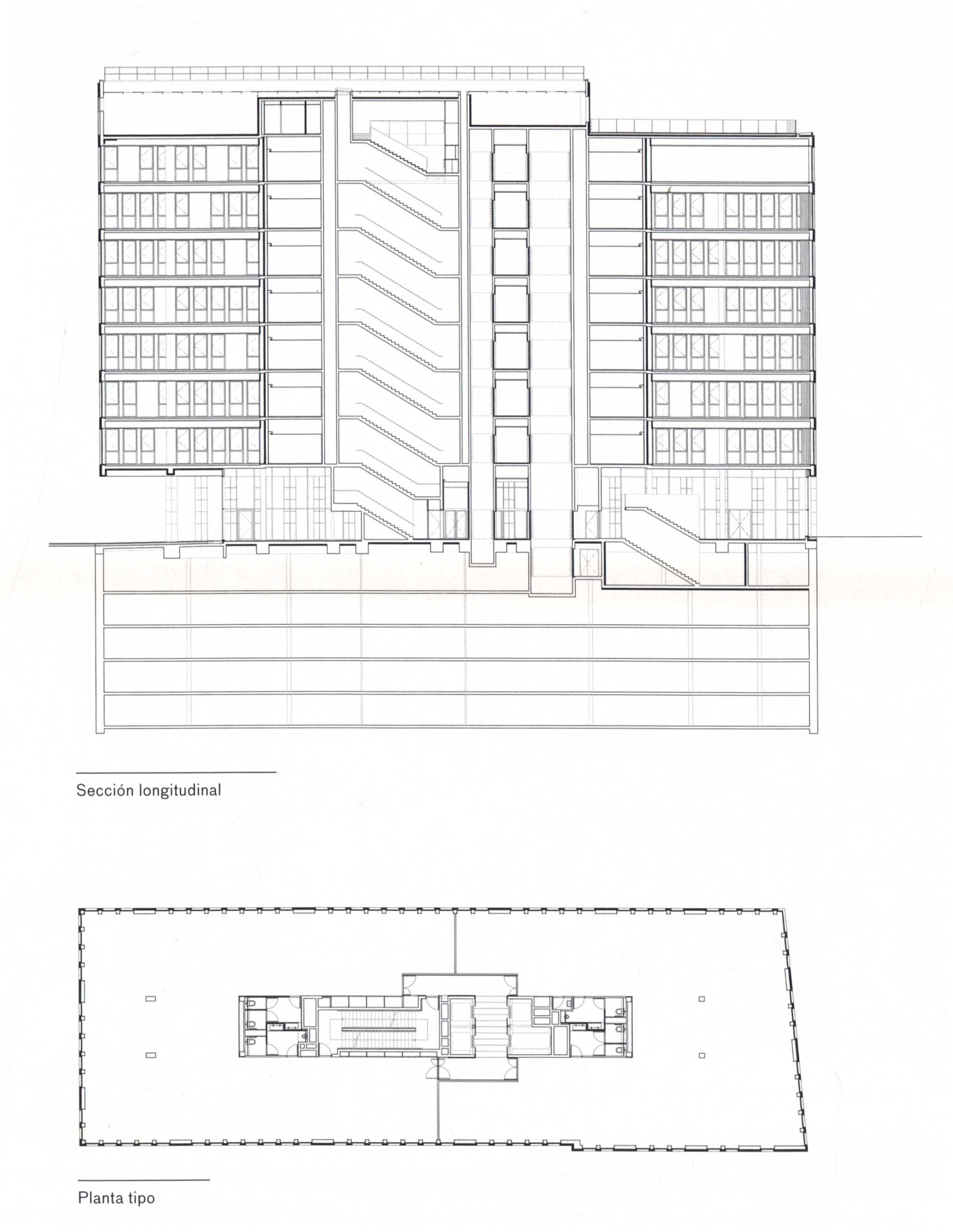 La estricta modulación de los despachos (2,t0 m) induce al empleo de una sola medida en la piedra 45×90 y una sola ventana de 90×2,70, con las únicas excepciones de la planta baja, donde el vidrio se retira, el remate, donde la ventana se agranda y se coloca en el plano exterior, y con la supresión estratégica de determinados huecos.