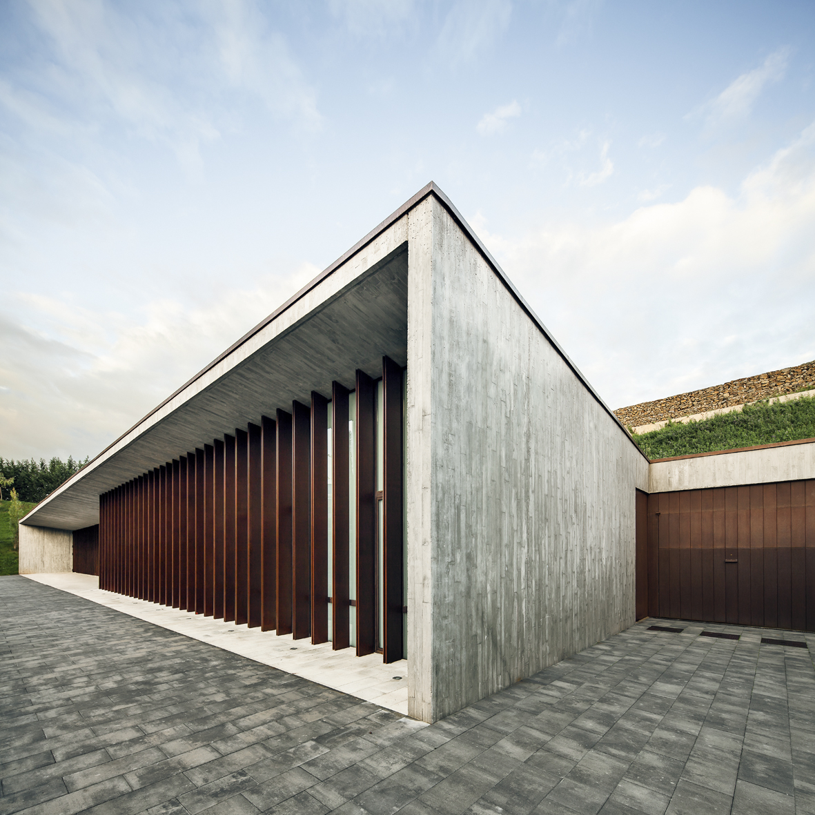 The structural system is composed of walls and reinforced concrete slabs formed with pinewood boards and corten steel pillars made of flat bars. All these elements define the building image and character providing simplicity to the materiality of the piece. The materialization is completed with natural stone pavements and wooden vertical facing producing interior warmth. The steel pillars generate a light gradient, establishing visual filters and protecting the interior from the direct sunlight.