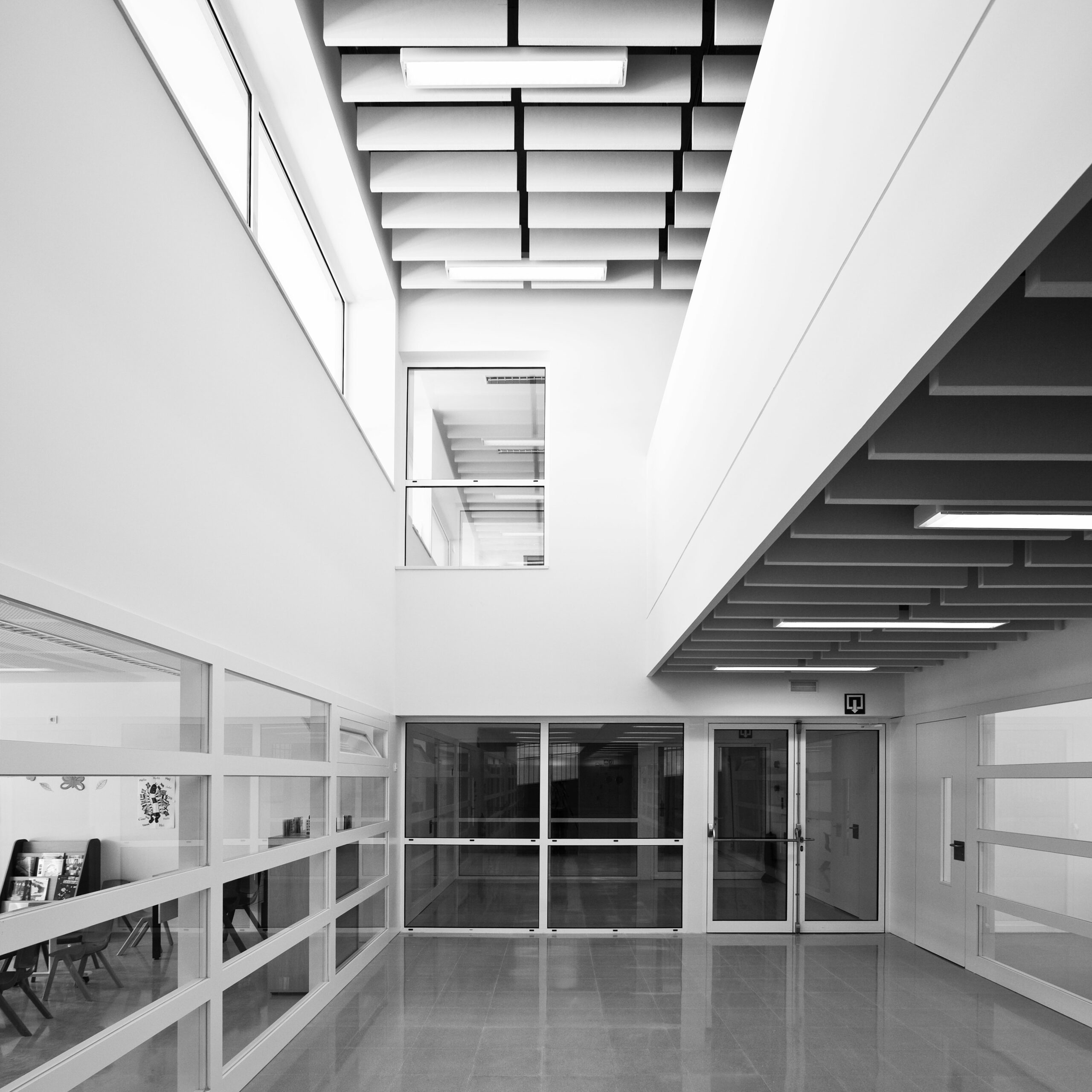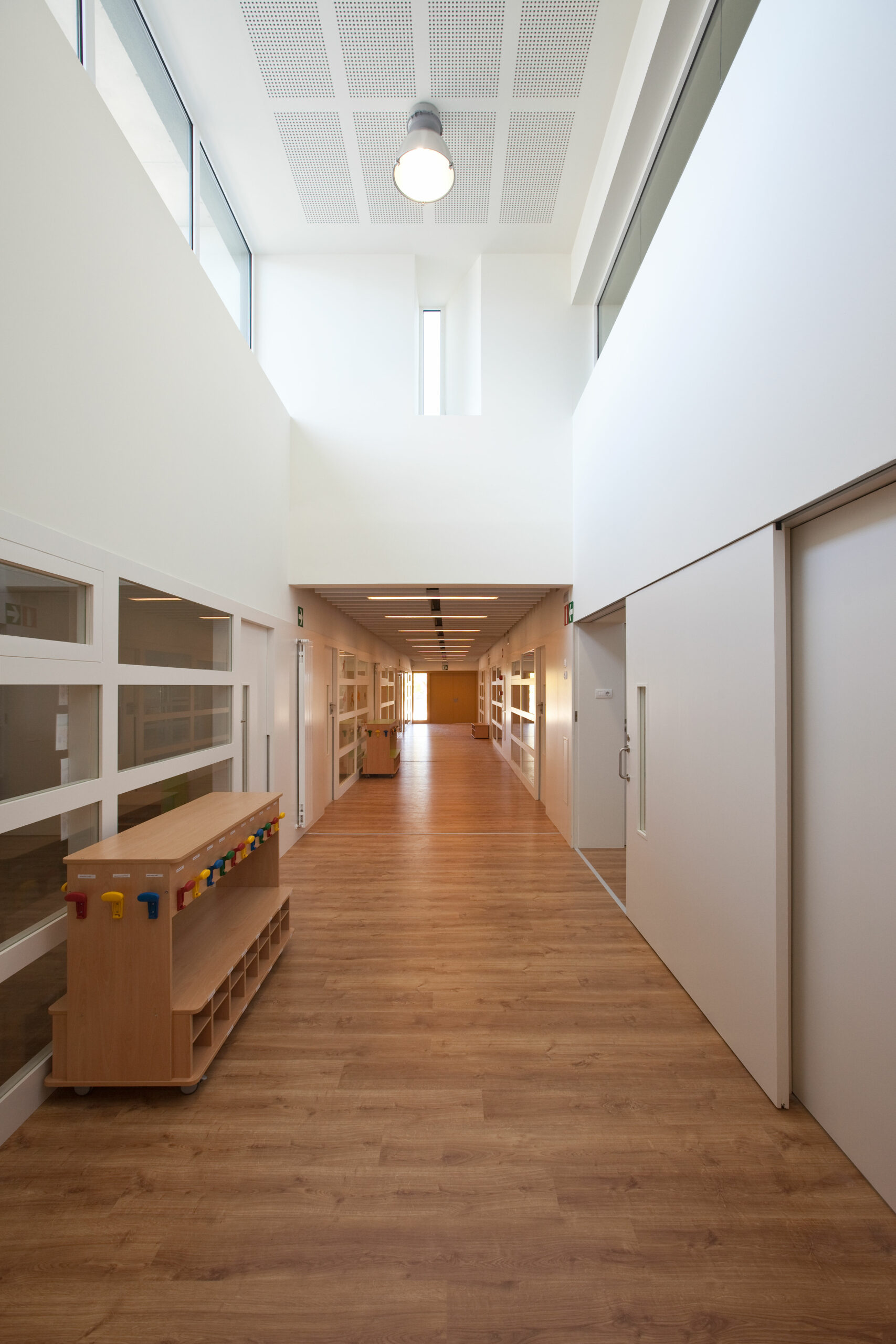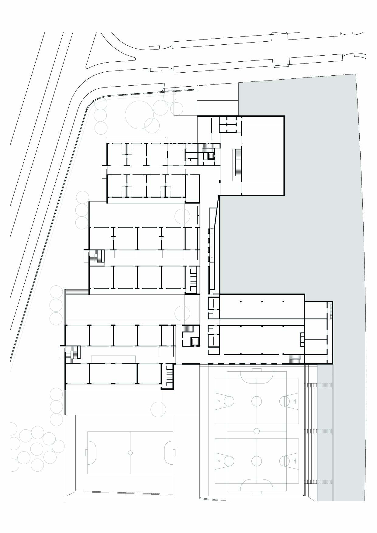 Els diferents pavellons que contenen el programa d’aulari s’endrecen seqüencialment: l’escola bressol i educació infantil –d’una sola planta-; educació primària, ESO i batxillerat de planta baixa +2. La connexió amb aquests pavellons es produeix, des de l’eix de comunicació, a nivell de l’accés principal en planta primera. Així doncs, cal pujar o baixar un nivell per accedir a la resta d’aularis.