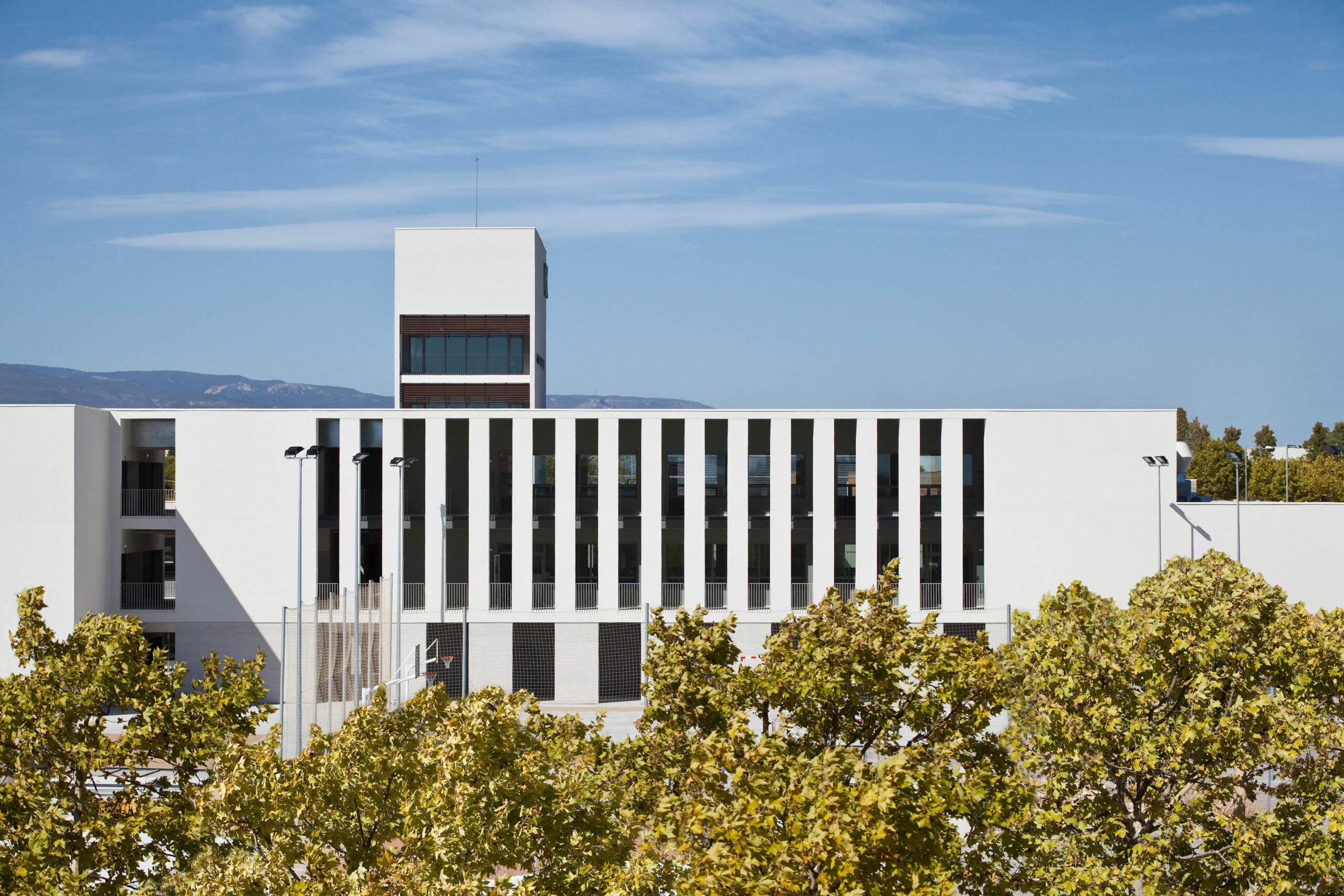 El límit E de l’equipament es presenta amb una façana contínua, de caràcter urbà, amb el tancament del cos administratiu, cuines, grades i gimnàs. El límit W, més obert al paisatge, està ocupat pels mòduls d’aularis i intercala els volums construïts amb masses arbrades que matisaran les visuals i protegiran dels vents dominants. El mòduls d’aularis, presenten, a Sud, una façana protegida del sol amb lamel·les horitzontals. Les façanes Nord es composen amb caràcter més tancat.