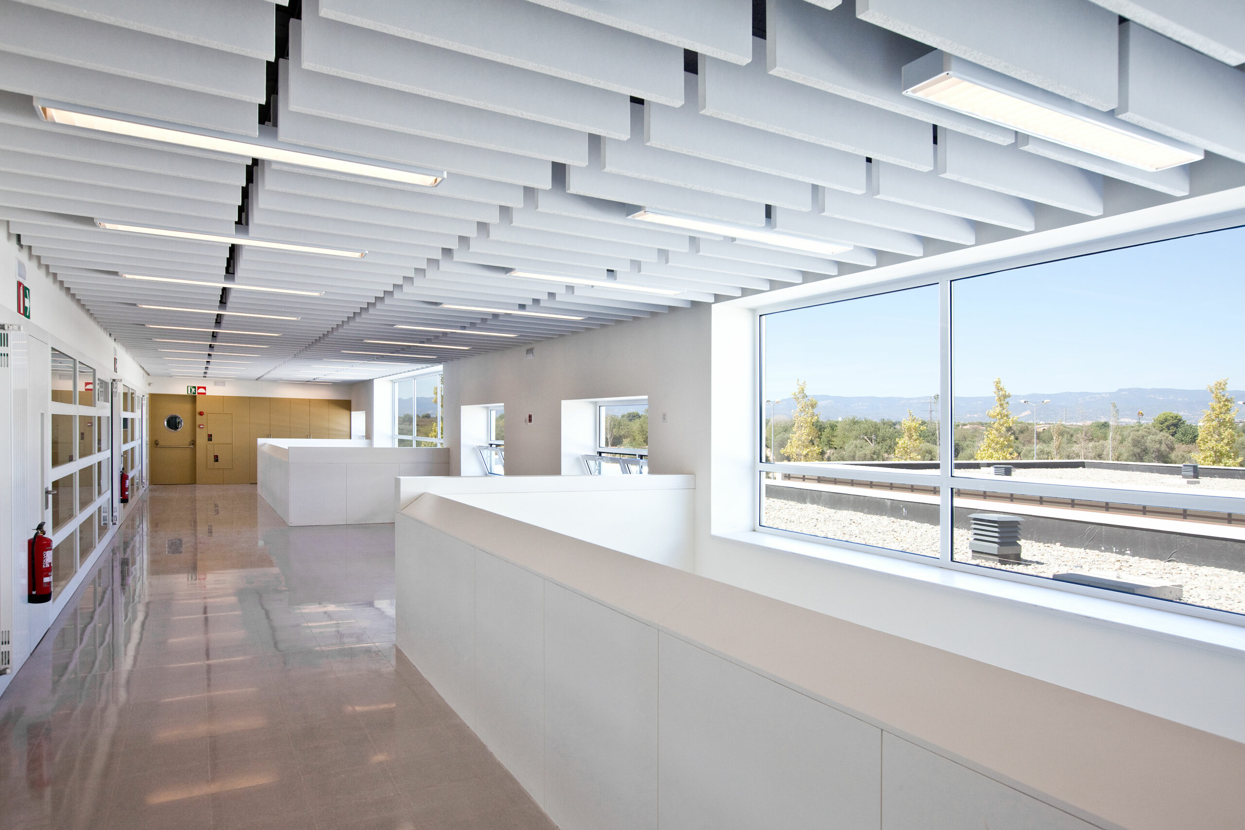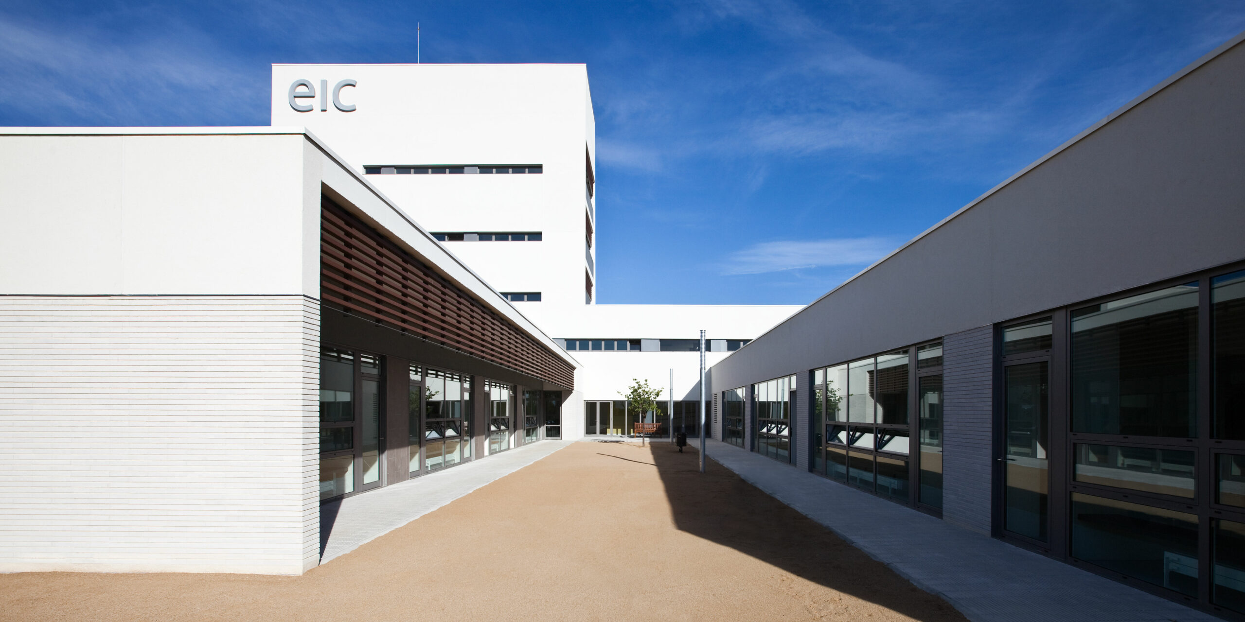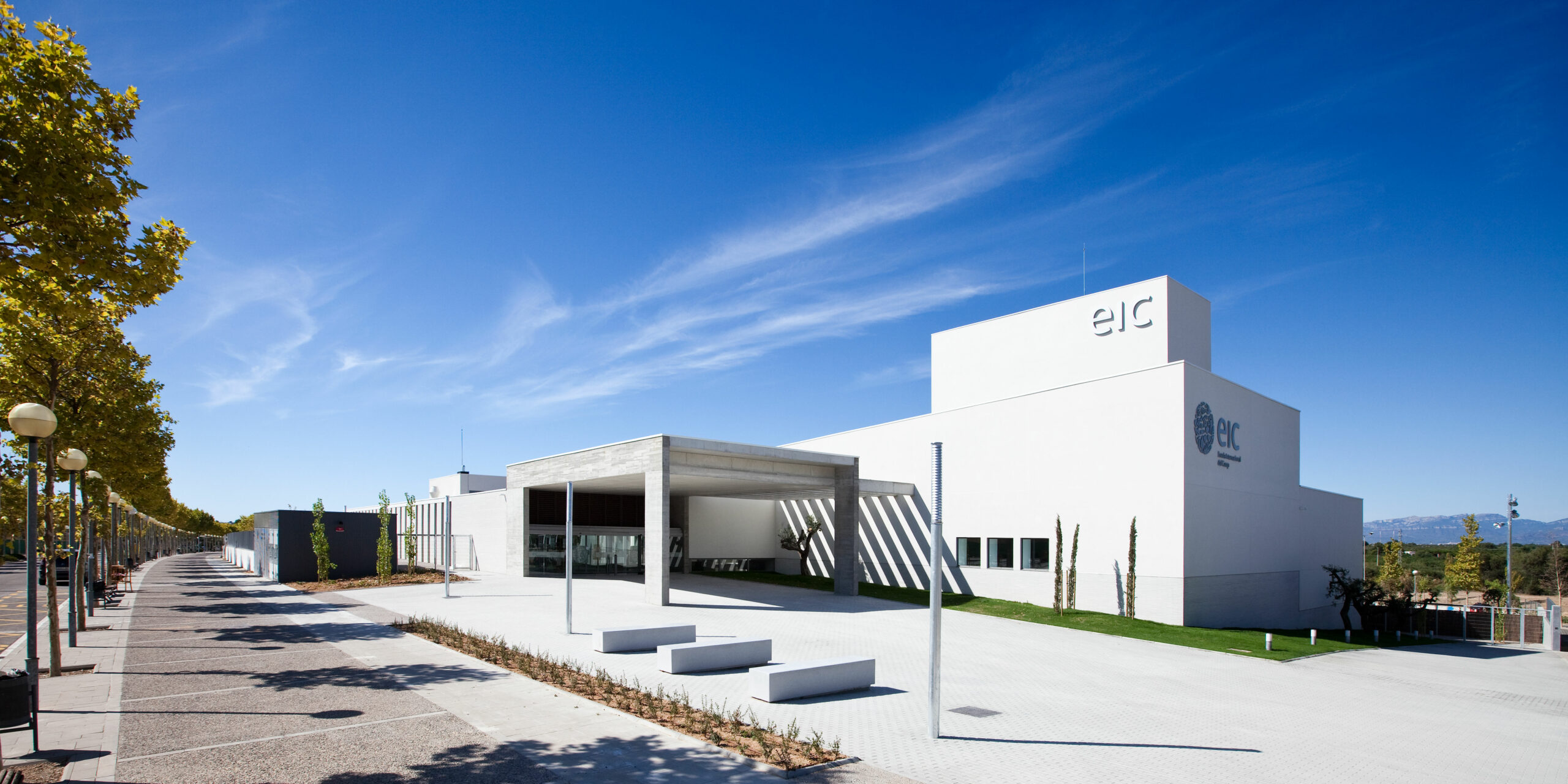 Des del vestíbul principal, s’inicia el recorregut a través de l’eix de connexió de tot el conjunt. El passadís semiobert connecta de Nord a Sud els mòduls destinats als aularis de diferents cicles i els espais de serveis comuns. En aquest recorregut, es situen els nuclis de comunicació verticals i els accessos als espais exteriors (Fòrum, pistes esportives, horts).