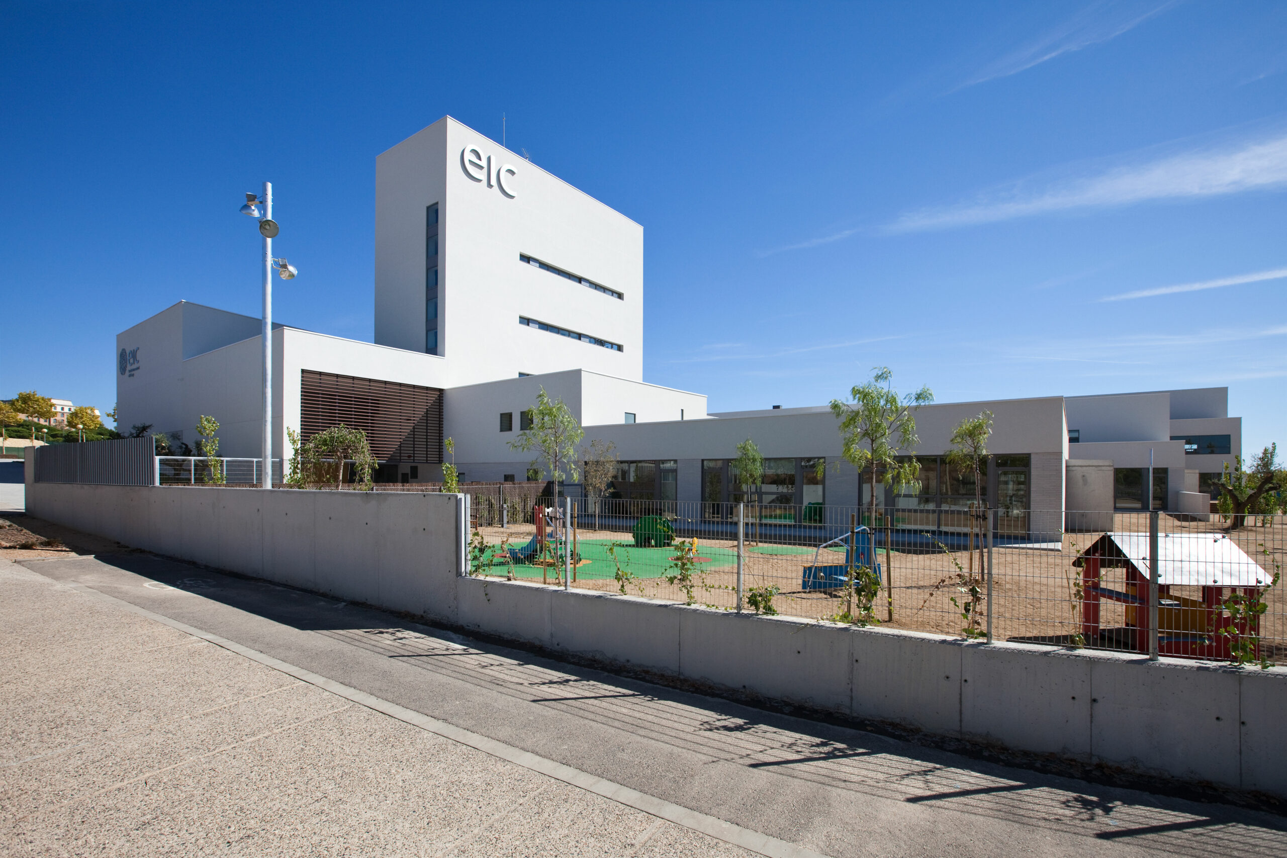 L’edifici docent es planteja com un sistema en espina i integrat per diferents mòduls d’aularis i d’altres serveis comuns. Les construccions, de planta baixa i dos pisos, com a màxim, es resolen amb un llenguatge d’arquitectura de volums regulars i murs blancs. Una torre s’aixeca sobre el conjunt com a fita vertical de referència i conté els espais més representatius de la direcció del centre i d’altres destinats a instal·lacions.