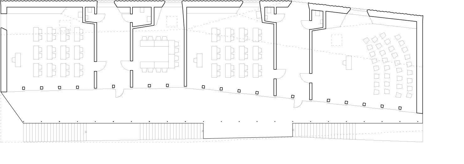 The building, accommodated on three floors, takes up the external flow standard of the existing pavilions. The staircase and the ramp give access to large outside corridors which lead directly to the cloakrooms and classrooms. The spaces defined by these corridors are likewise used as external extensions for the classrooms thus allowing, in line with the educational principles of the school, a teaching in direct link with the surrounding natural elements.
